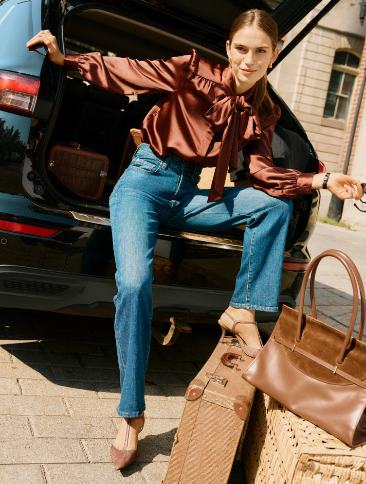 Mix boardroom confidence with lived-in denim—proof that elegance is the ultimate carry-on.