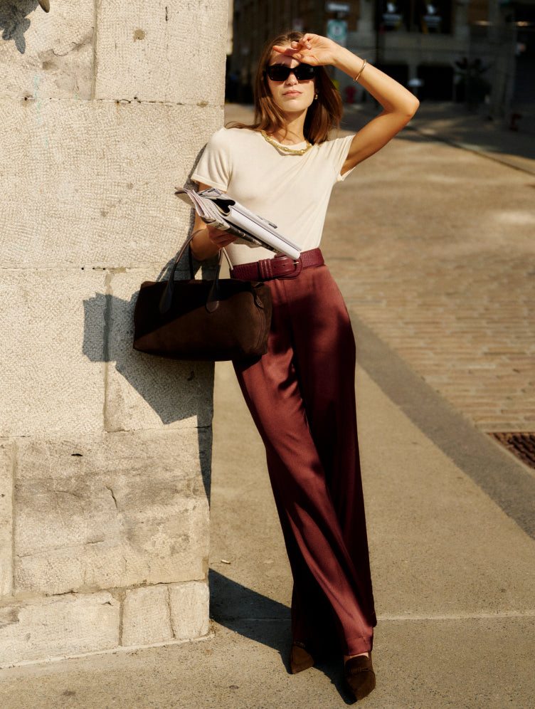 Elevate your everyday commute with dressed-up pants in current chocolate and a luxe cashmere tee that works as hard as you do.