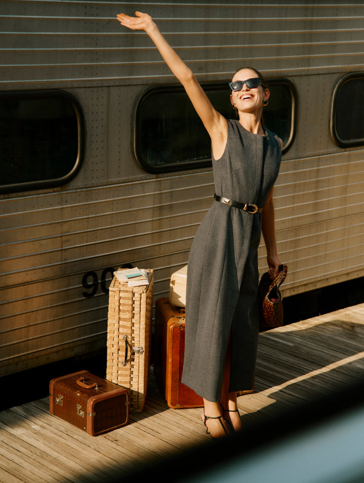 Channel the golden age of train travel in a belted shift dress, dark shades, and a dash of leopard.