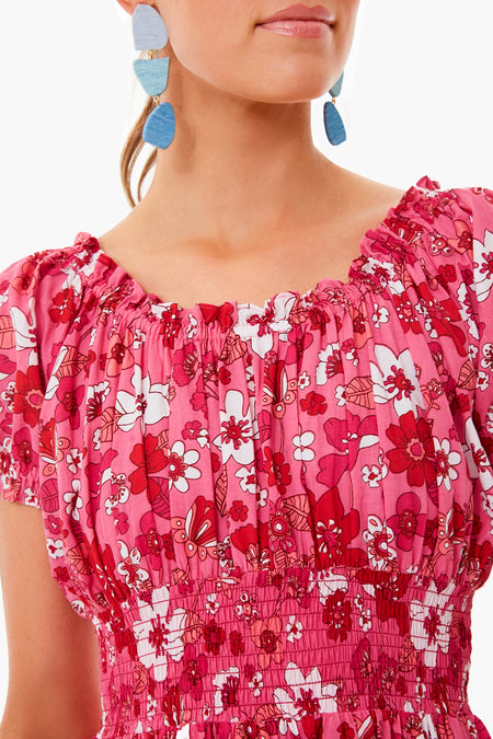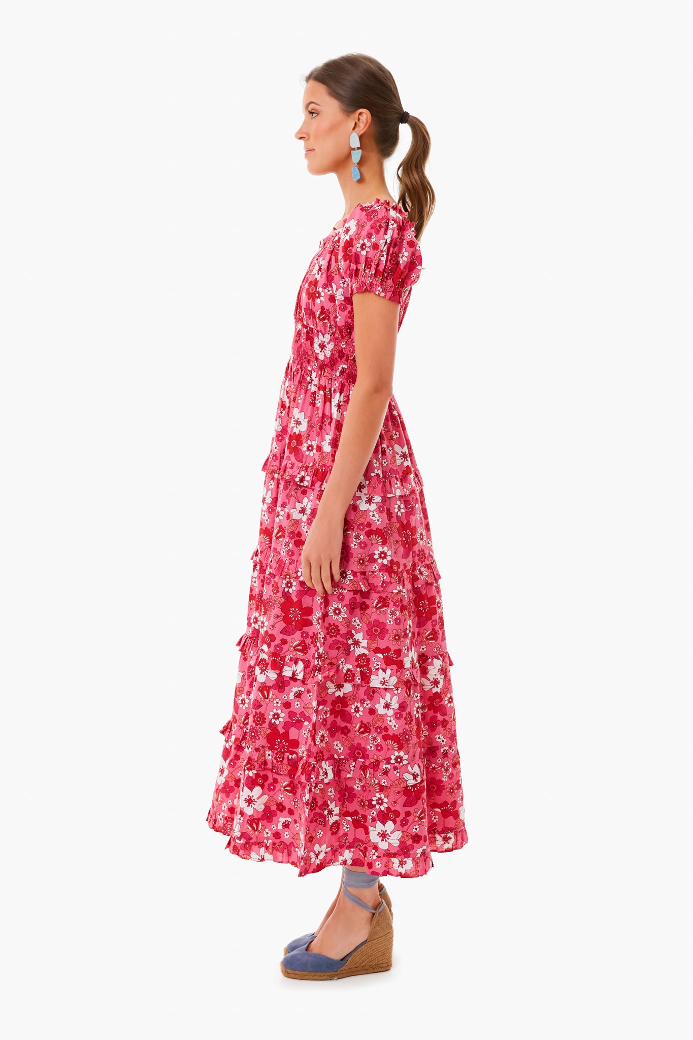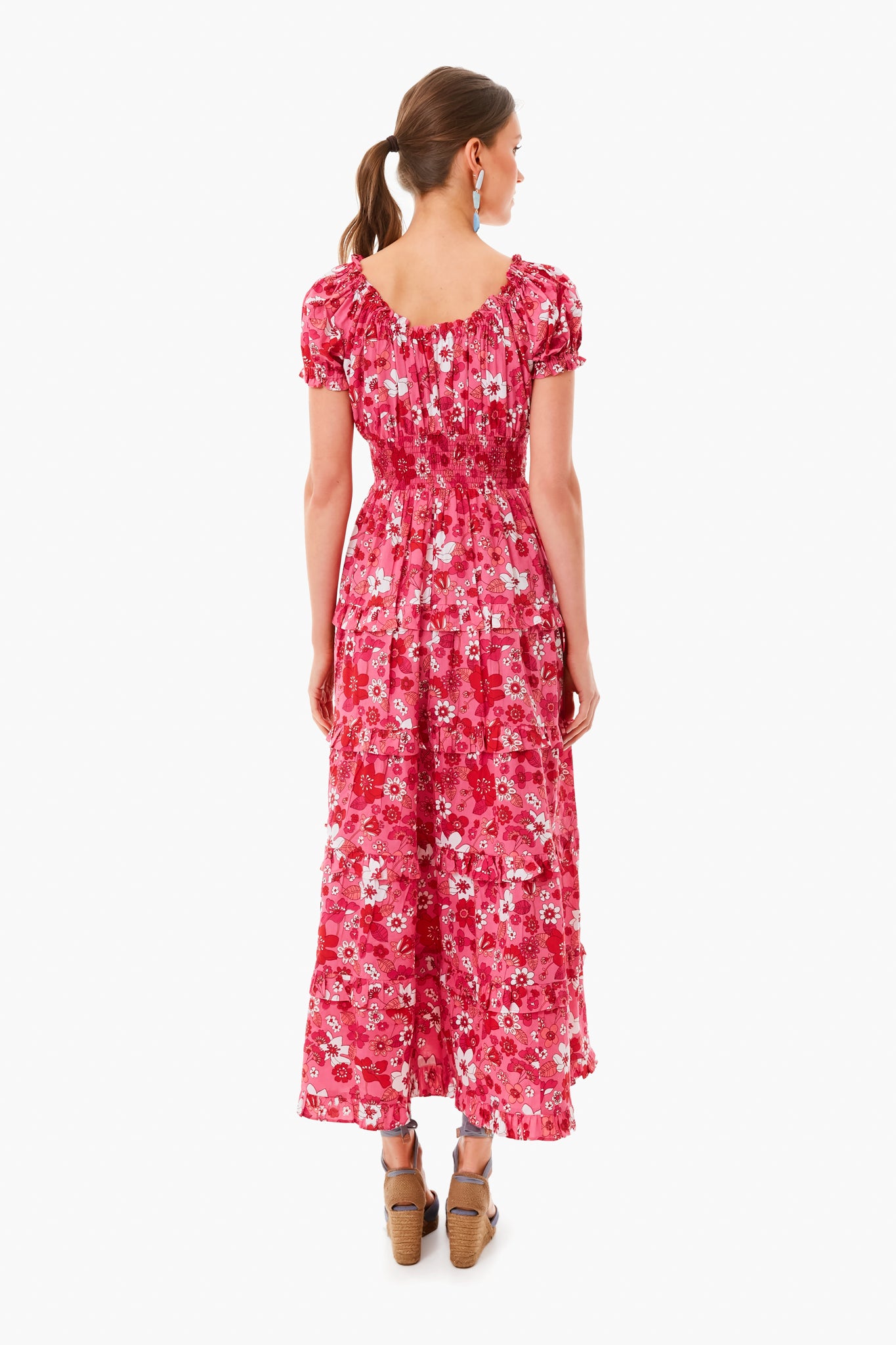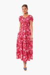The 70s Strawberry Rah Rah Long Dress is made from lightweight and breathable cotton. This style features a smocked neckline that can be worn on or off the shoulder, an elasticated waistband, and a tiered ruffle skirt. Pair with pearl earrings for a classic and bold look!