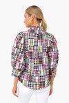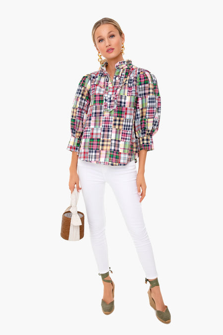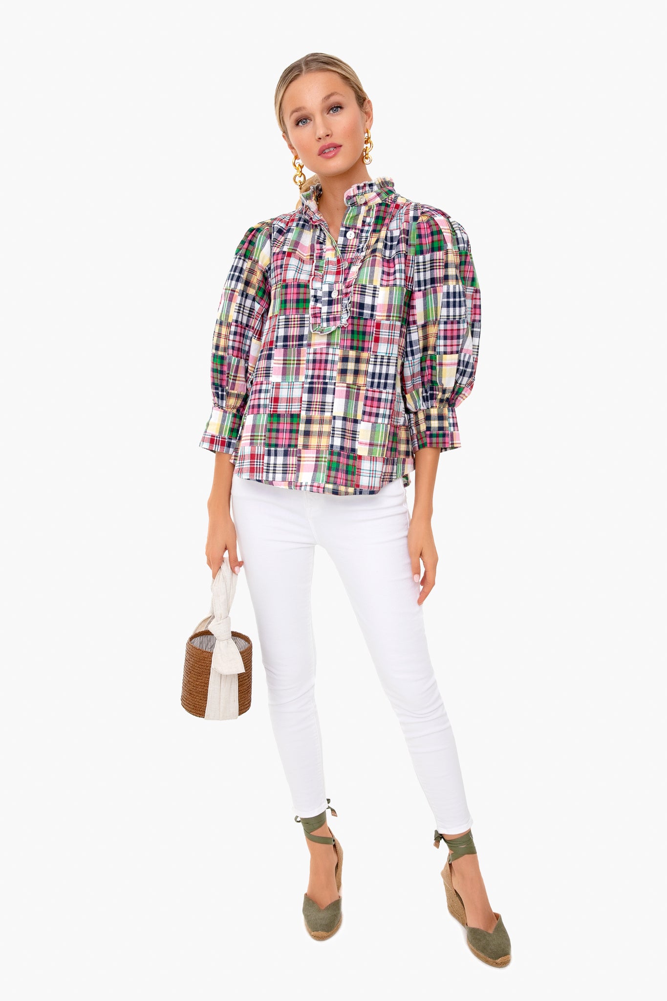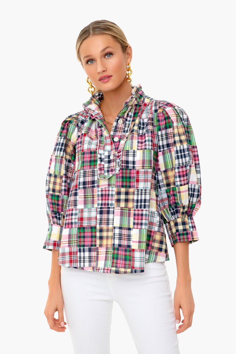 The Alama Blouse is made from a patchwork of colorful madras checkered fabrics. Featuring a ruffled collar, mother-of-pearl buttons, and three-quarter length puff sleeves, this top is feminine and unique. Pair with denim and gold jewelry for a weekend outing!
