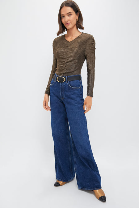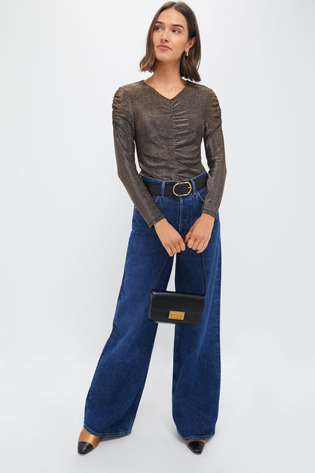 The Neeta Top features a slim fit, center ruching, and a striking metallic gold color. Wear it on its own, or as a base layer. We chose to pair it with jeans, a metallic boot, and a crossbody bag to elevate everyday style!