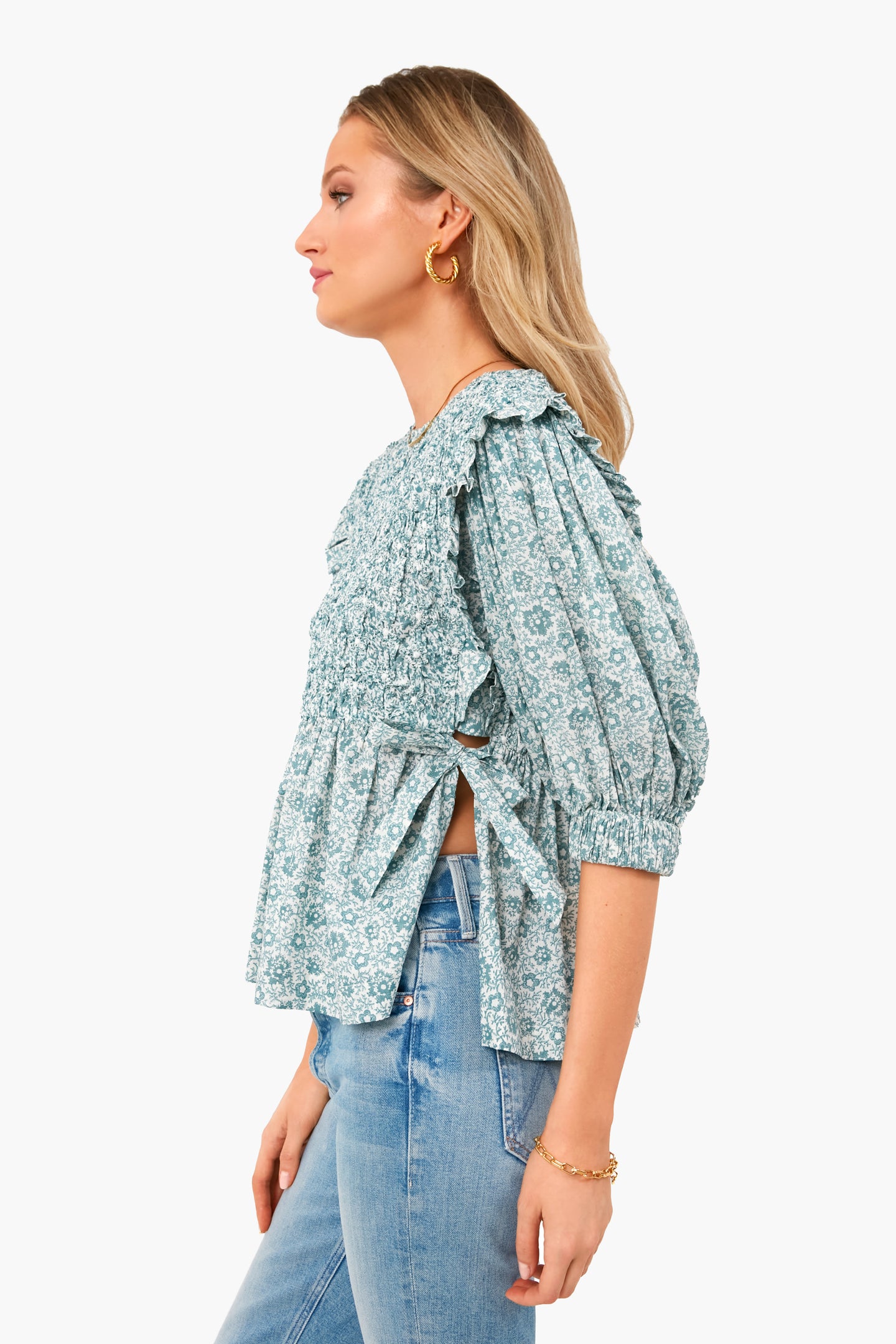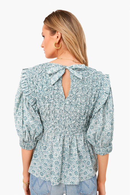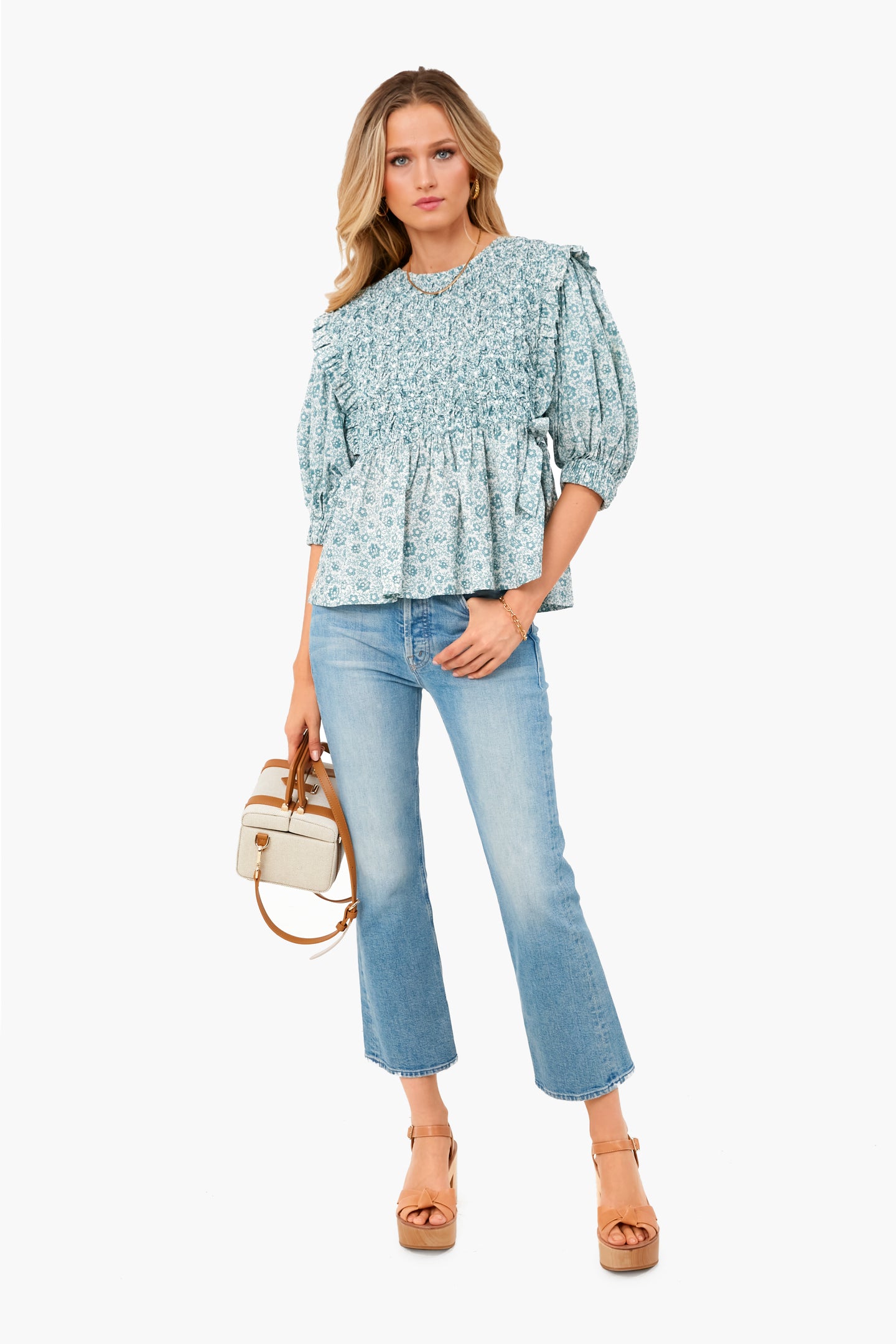The Apple Green Ida Print Puff Sleeve Smocked Top features a crewneck, smock bodice, three-quarter length puff sleeves and a flatter peplum waist. Made from cotton, this style is ready for sunshine! Add wedges and gold jewelry for a resort-ready look.