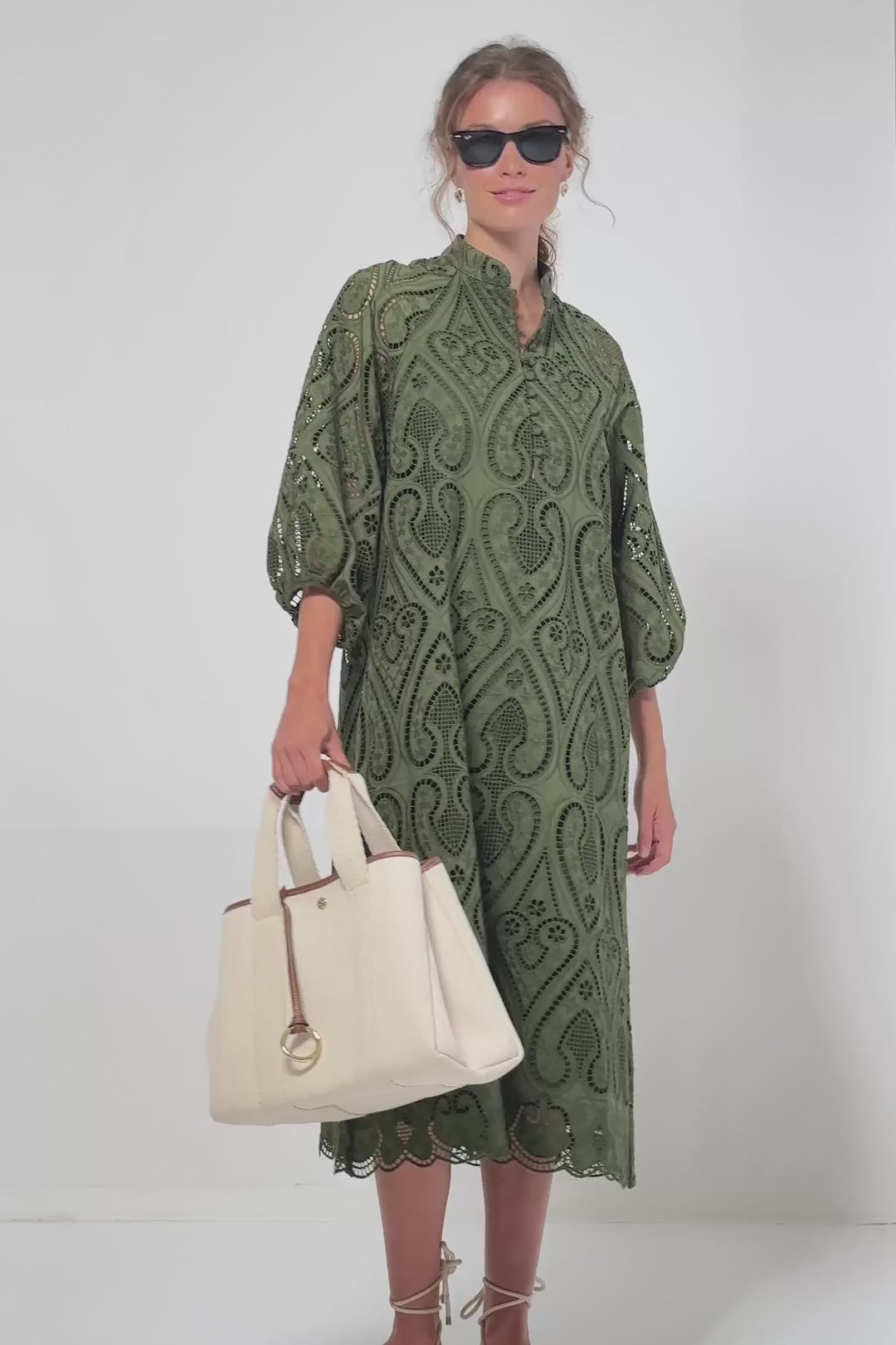 We all love the kind of silhouettes that feel effortless yet look elevated. Striking that perfect balance between breezy and breathtaking, the Army Green Eyelet Maryse Caftan is a wardrobe hero. With details like a chic mandarin collar, fabulous balloon sleeves, and a gorgeous eyelet embroidered fabric, you can wear this number with heels and statement earrings for dinner or over a bikini with your favorite sunnies for poolside relaxation. That makes it an essential style in our book — versatility is key!