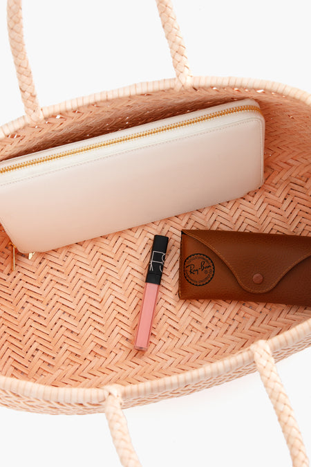 Craig Wright, the designer of Dragon Diffusion bags, began crafting exquisite woven leather objects in 1985. With years of experience behind him, Dragon came into fruition. Handmade in India, the Triple Jump Basket is beautifully woven and made of top quality leather meant to soften and age beautifully with time! The pink leather gives this classic bag a fresh look and would be perfect to use for a day at the beach!