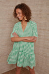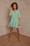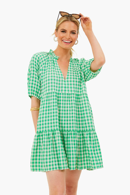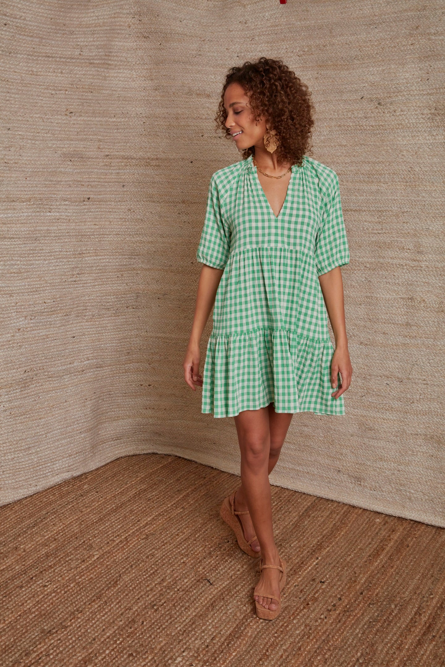 The Basil Picnic Ready is made from a cheerful gingham print with a swingy silhouette. Featuring a split neckline, short puff sleeves, and tiered mini skirt, it is ideal for taking a twirl around the park or bringing voluminous movement to your brunch with friends. Just add gold jewelry and wedges for a chic, spring look!