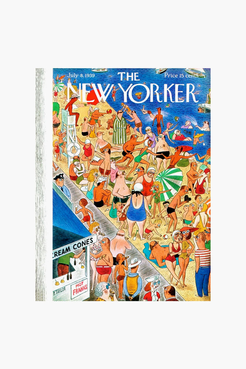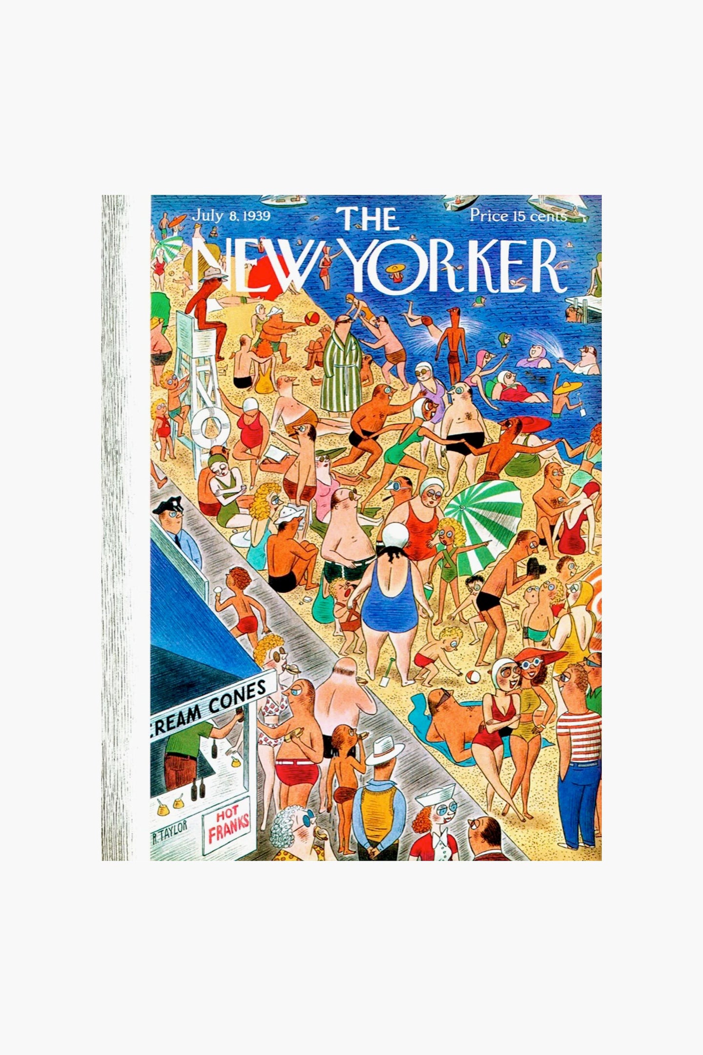 A busy day at the beach. Seems as though everyone has the same idea this sweltering July day. This crazy crowd is doing everything under the sun; tanning, chatting, eating, splashing, swimming, ogling, and having a general good ol' time. New Yorker cover from July 8, 1939 by Richard Taylor. The covers of The New Yorker have entertained and enlightened the magazine's readers for nearly a century. With unmatched visual sophistication and wit, they let no subject escape their scrutiny. A roster of extraordinary artists continues to create indelible images that are infinitely varied in style and tone, whether whimsical, provocative, serene, or lough-out-loud funny. From the iconic Eustace Tilley to spot-on images of contemporary life, The New Yorker's covers are always the talk of the town.