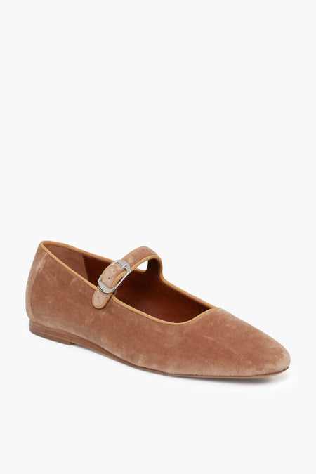 The Beige Velvet Mary Jane features a buckle, cushioned calf leather insole, and grosgrain piping. These are the perfect feminine, classic shoes to pair with jeans and a blouse for an easy yet chic day-to-night option.