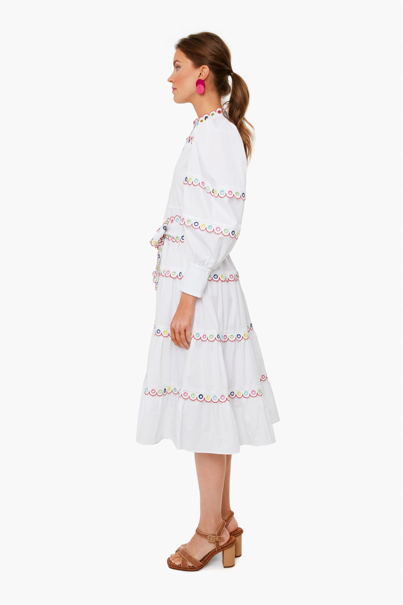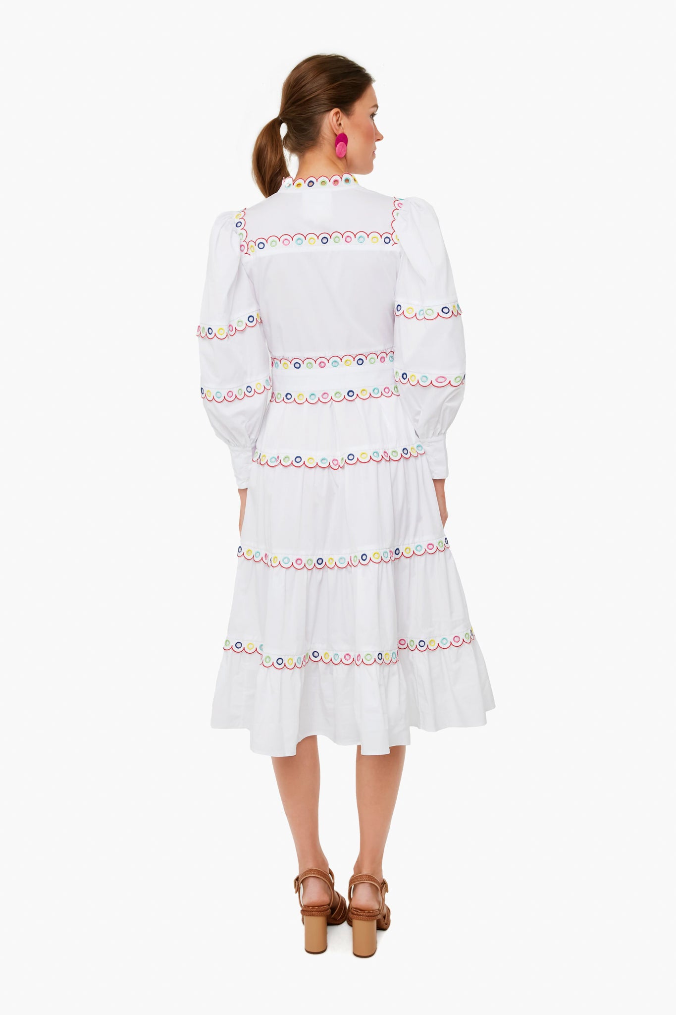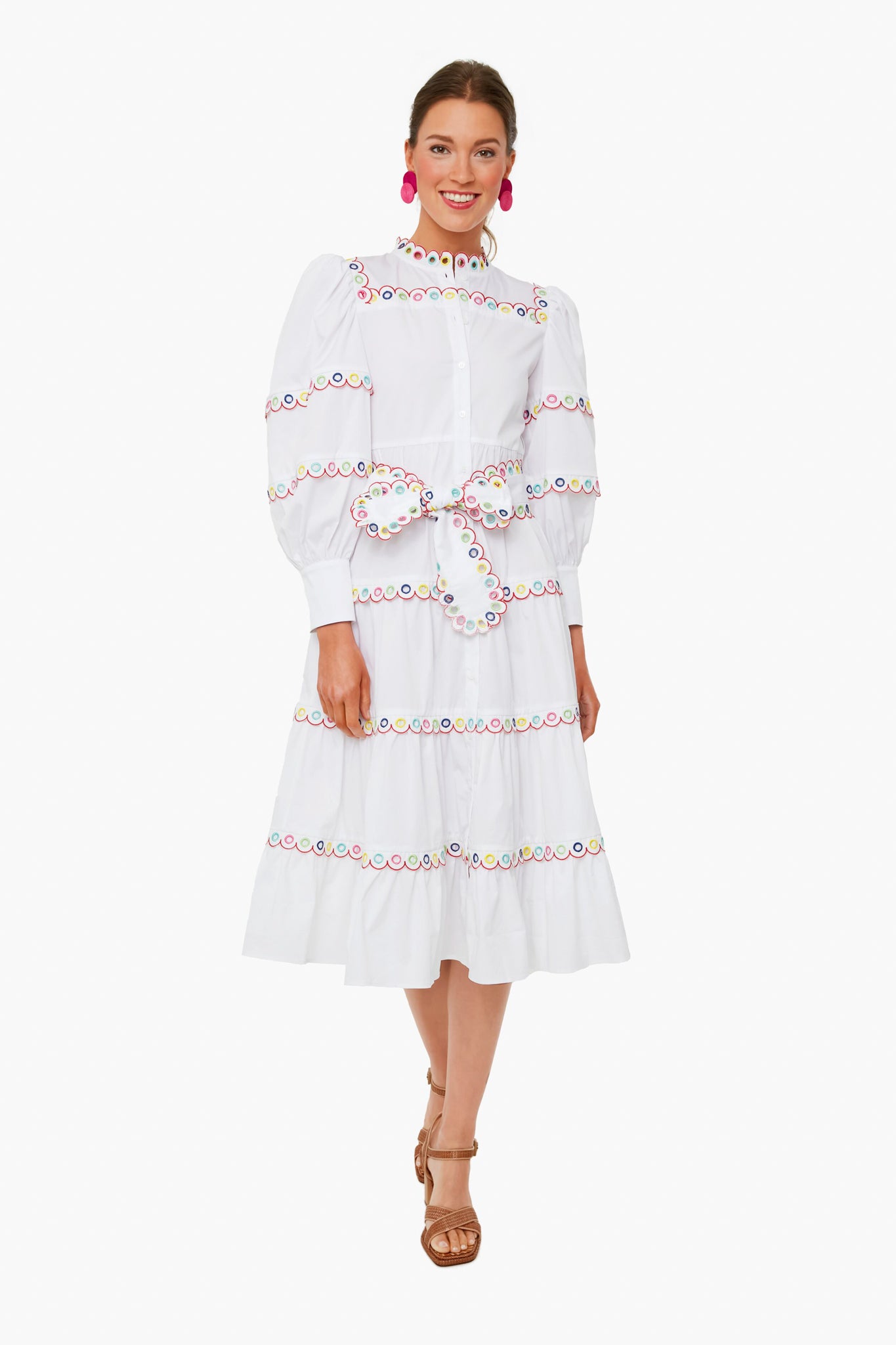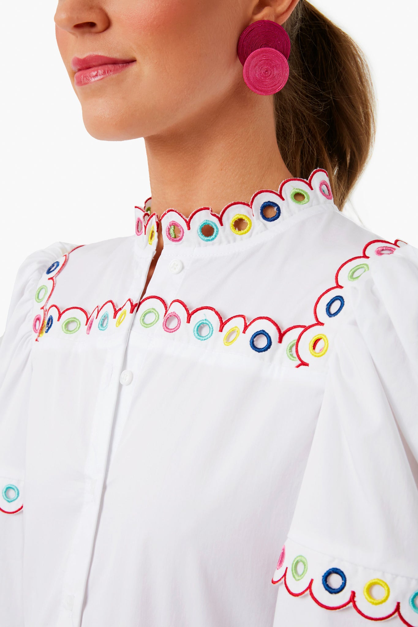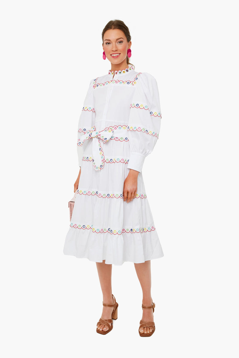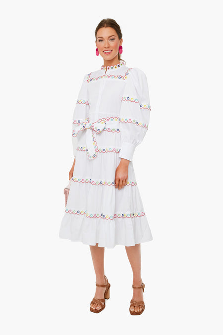 The Bianca Dress features a high neckline, puff sleeves, button down front placket, and colorful eyelet trim. Made from the perfect palette of tropical-inspired hues, it can be paired back to sandals or heels. From vacation dinners to days spent exploring a beachside town, this style will be comfortable and chic.