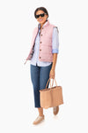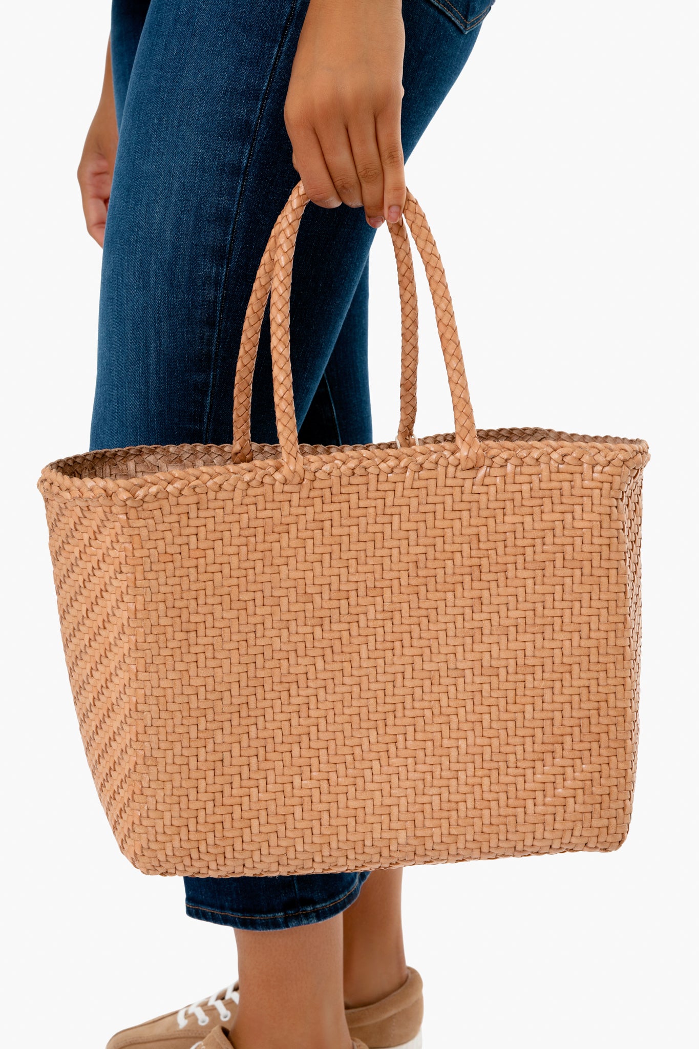 The Big Basket Double Jump Bag has a rectangular body with an open top and braided handles. We are wearing it with turtlenecks and sneakers for comfortable on-the-go style.