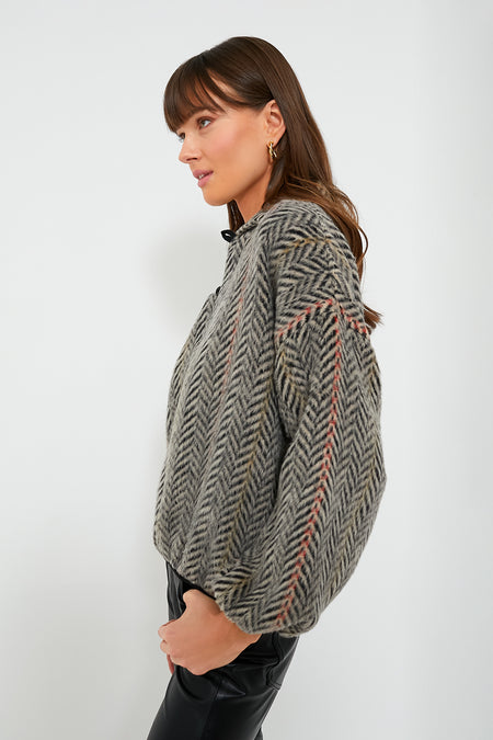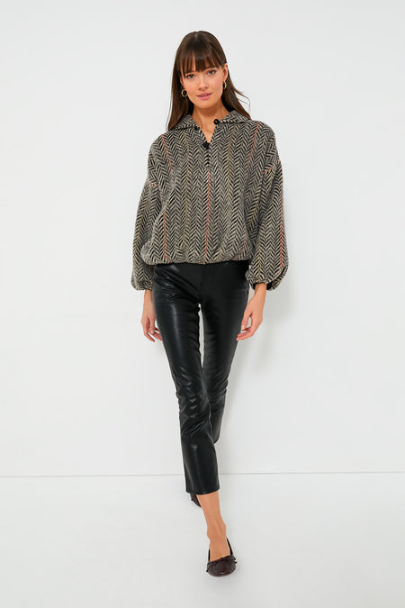 This perfectly slouchy pullover is our favorite vintage-inspired layering piece. Super soft for a season of comfort, the brushed woven body features chevron stripes with unexpected pops of color running throughout. The fit is complete with a button front placket that eases into a collared neckline, subtle blouson sleeves with elasticated binding, and nostalgic details like cotton twill tape loops and real corozo buttons. Pair with knit trousers and sneakers for walks around town, or with black pants and red flats for a fun office look.