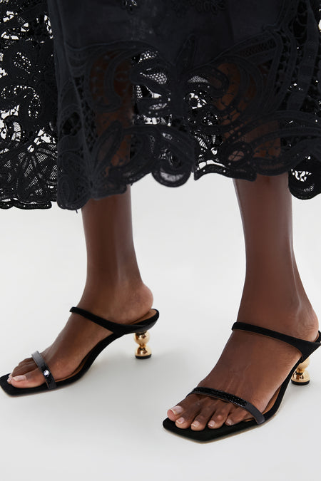 The Black Ali Heels are perfect for dancing the night away. With a square two, gold statement making heel, and easy slip on styling, these heels are easy to style for weddings, showers, and other dressed-up occasions!