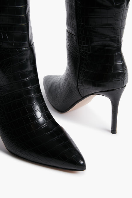 Take a walk on the wild side with the Black Alina Boots. Beautifully crafted from faux leather with reptile-embossed detailing throughout, these shoes feature a padded footbed for all-day comfort and offer a sleek stiletto heel for a subtle feminine touch. Slip them on for easy styling, then wear these stunners with midi dresses, maxi skirts, denim and more!