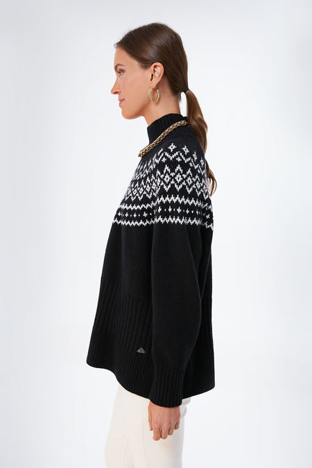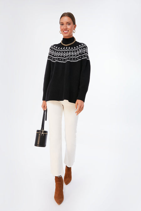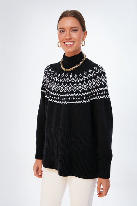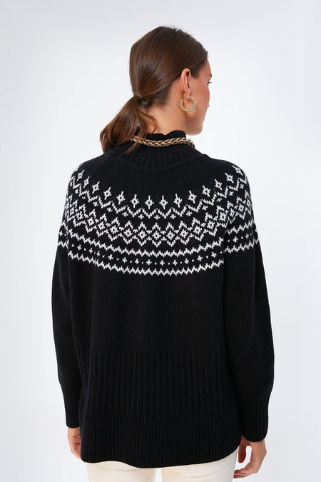 The Black Amberly Knit brings comfort without the bulk in a classic Fair Isle print that is perfect for cooler seasons. In a cotton-wool blend, this soft sweater with a high funnel neck and ribbed trim will keep you warm no matter what the weather throws at you. Style with denim and your favorite booties for a cozy look that can handle a day of running errands around town, or with leggings and a beanie to hang out in the lodge and drink hot toddies.
