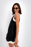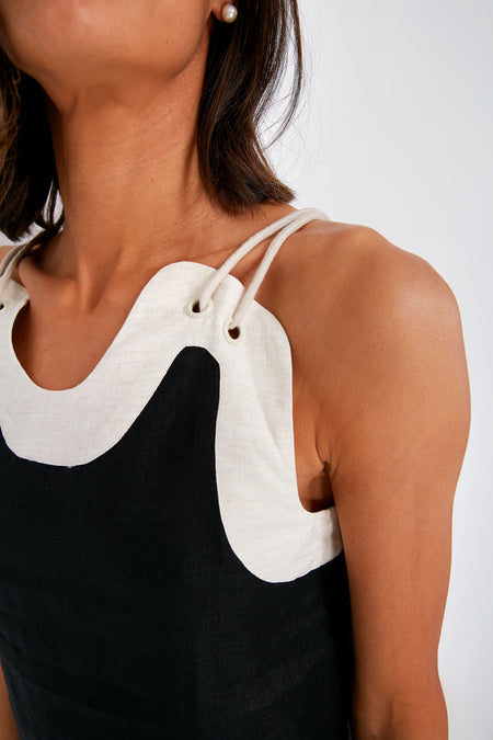 A sleeveless linen trapeze silhouette, the Black and Natural Renata Dress is simple and bold all in one! Designed with contrast wiggle trim and natural rope straps, this little number dares to stand out from the rest. From beachside cocktails on vacay to dinner out with the gals, this sassy style is sure to receive lots of compliments.