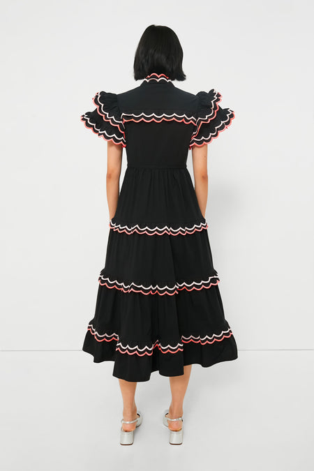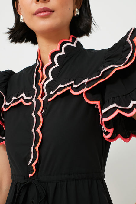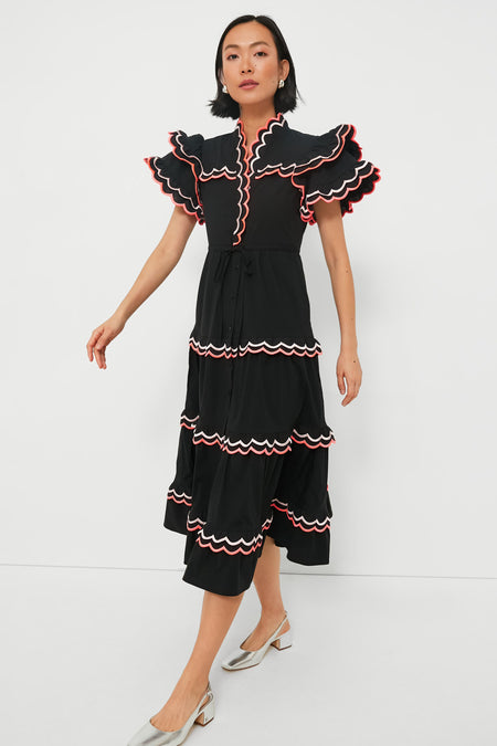 Fluttery, feminine, and flattering, the Black Antartico Dress is truly a stand out piece your closet needs. Boasting a classic brand silhouette this tiered midi features a button front, flutter sleeves, self tie at waist and thick embroidered scallop trim in neon and pale pink. Easy to wear three seasons a year, this silhouette will have you head over heels. Opt for heels and gold accessories for a romantic and feminine look, whether it's for brunch with the gals, date nights or cocktail parties.
