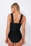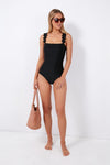 Nothing says chic quite like solid black swimwear, and the Bubble Swimsuit with Straps does it better than most. Timeless and wearable aspects like a square neckline and moderate back coverage are elevated by the uniquely scalloped details at the shoulder that allows you to have fun with your look. From sipping poolside palomas to walking the beach at sunset, you will love wearing this effortless silhouette for all of your warm-weather activities.