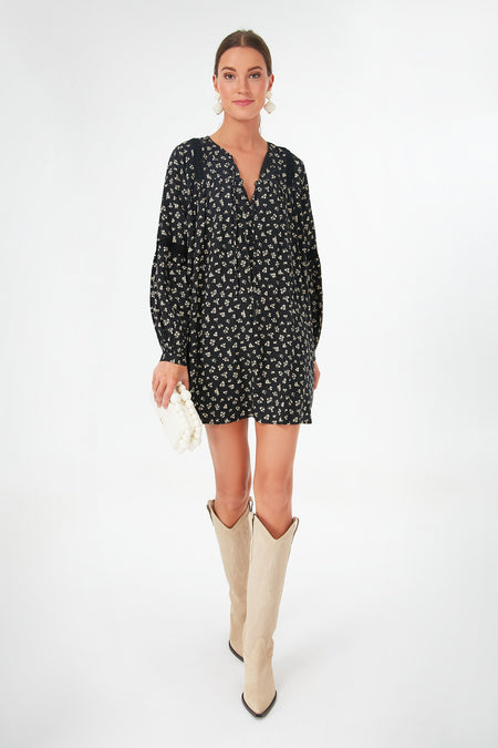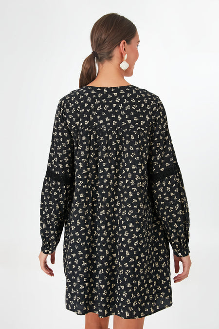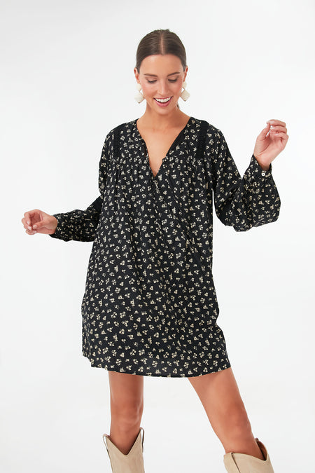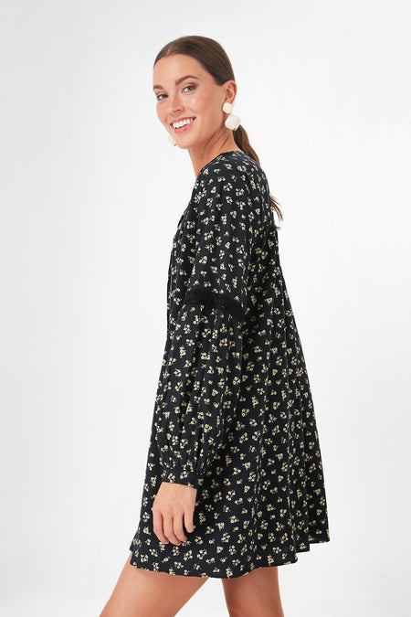 You simply can't go wrong with the Black Cream Floral Twilight Dreams Dress. This shift silhouette mini features two bust ties, hidden pockets, and crochet trim detailing throughout for perfect romantic fall dress. The perfect dress up or down number, add some edge by styling with high boots and a leather jacket or create an everyday style with sneakers and sunglasses.
