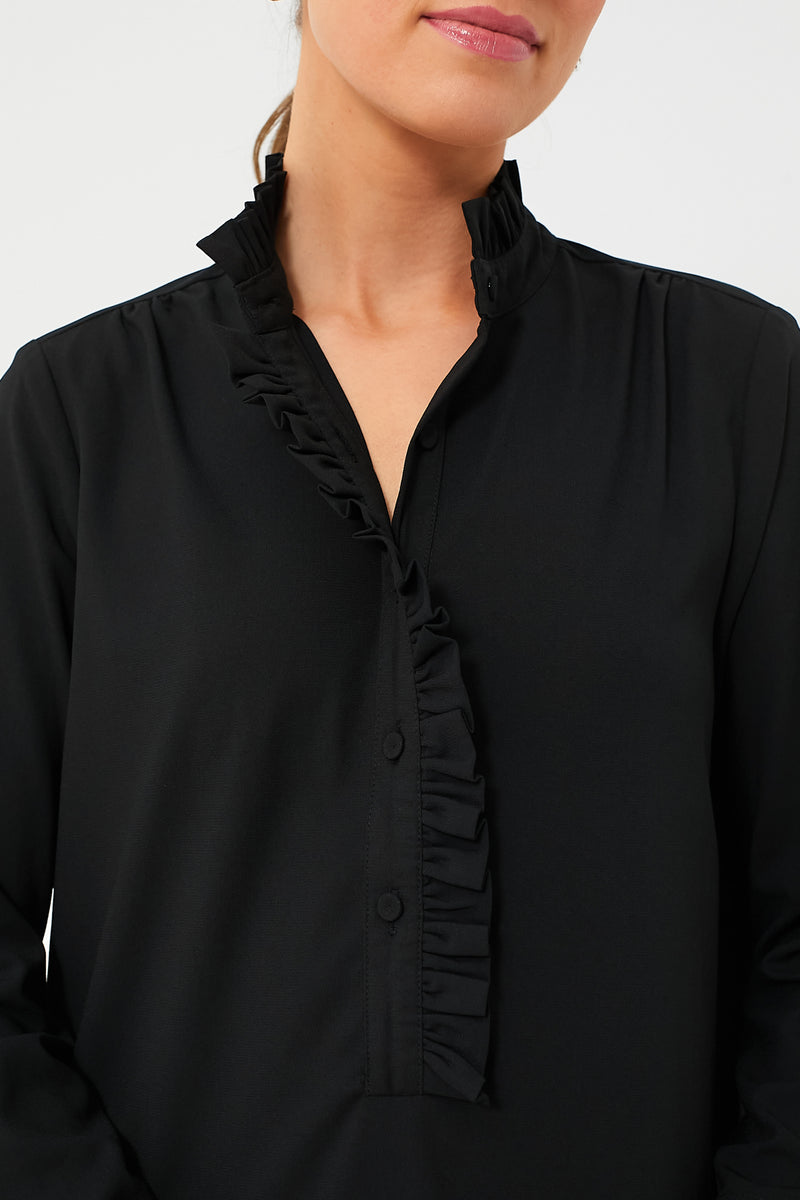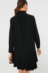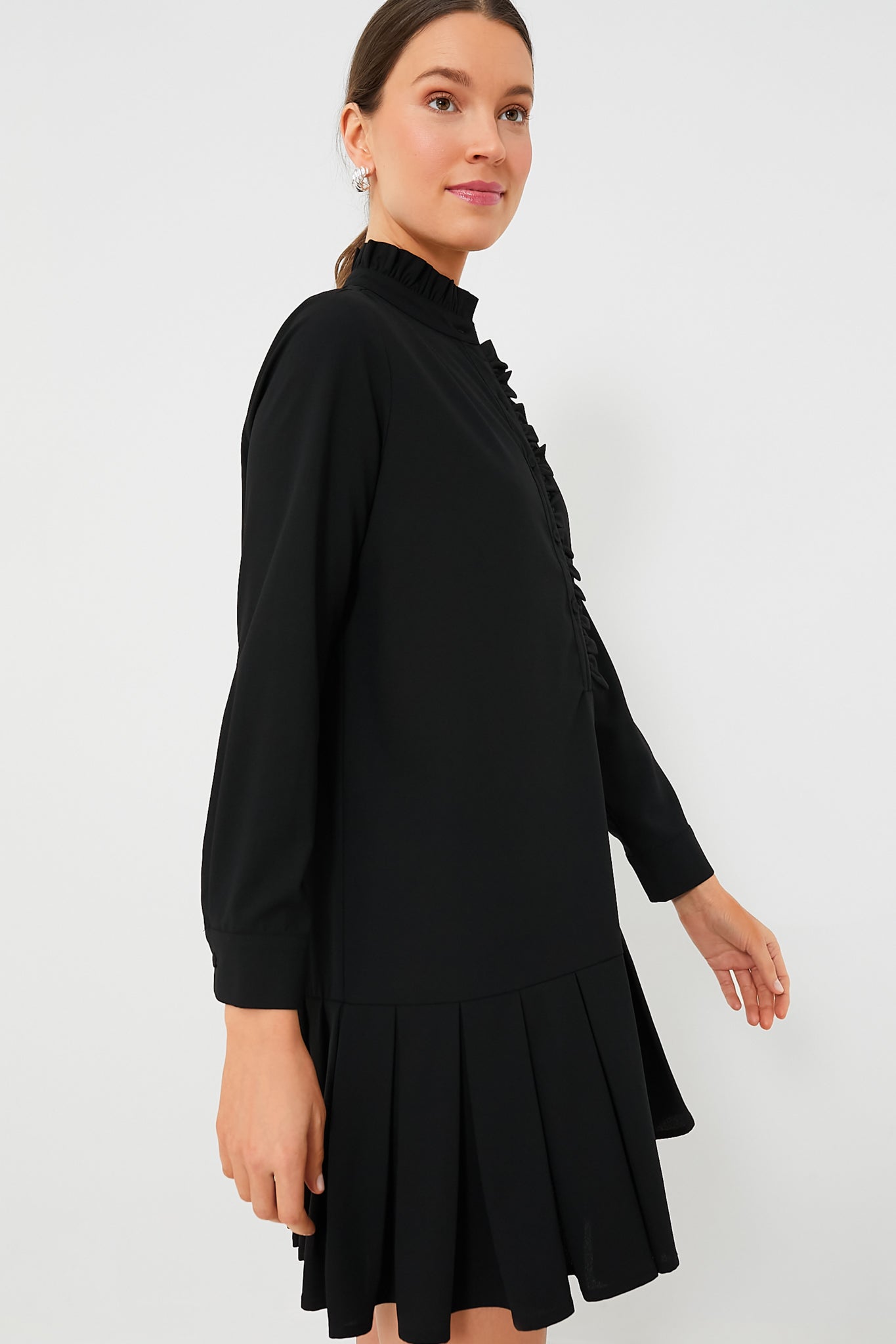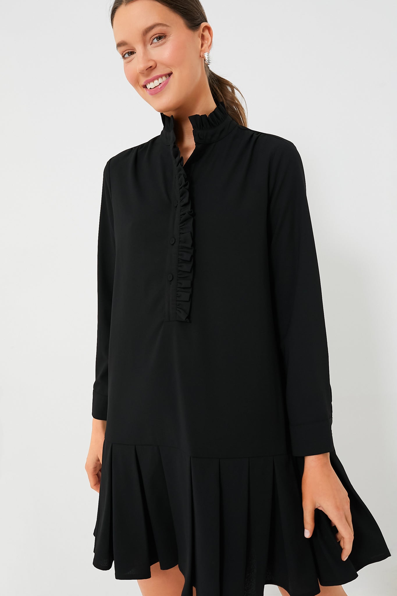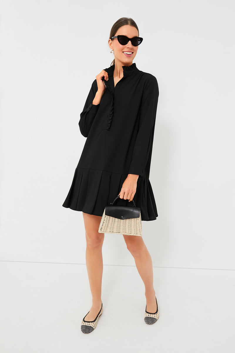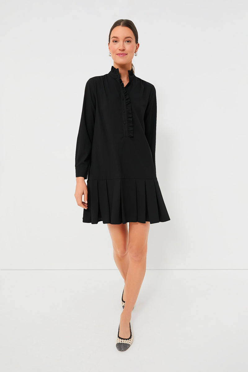 A charming update to the closet staple shirt dress we love, the Black Crepe Tate is a timeless LBD that can be dressed up or down, season after season. This mini seamlessly combines sophisticated details like a ruffle collar and a half placket, a perfectly pleated swing skirt, and the best part, a boxy silhouette that isn't too tight but is ultra-trendy. Easily encapsulating unfussy femininity, this elegant number is a four season stunner that will take you from the boardroom to brunch with ease and style.