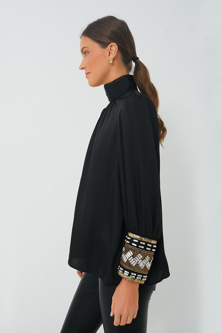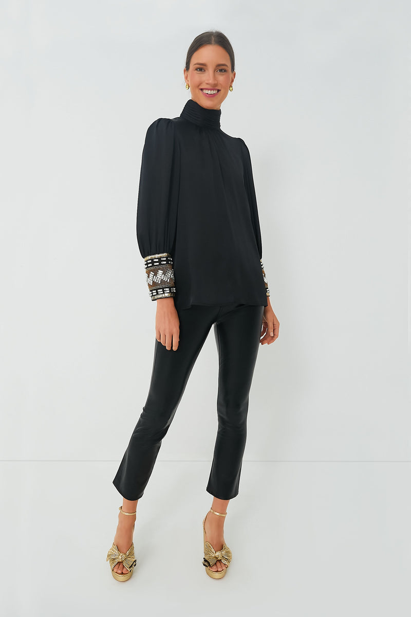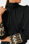 A best-selling dress style given a fresh look as a top, the Black Embellished Faven Blouse is elegance embodied. We love the combination of lightweight, silky material that is unlined for a gorgeous drape, and the structure from the mock neckline and beaded cuffs. Style with mini skirts or denim, boots or heels, a clutch or statement earrings — it's sure to stun regardless!