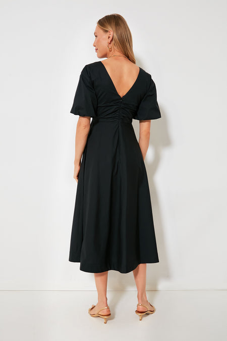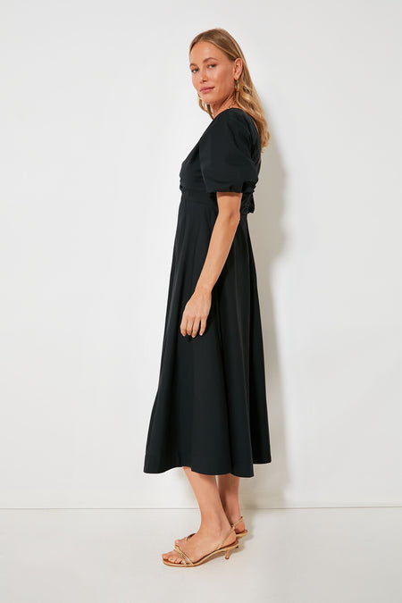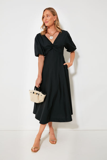 A style staple for upcoming events, the Black Finley Dress is one of those items that is great to keep in your closet for when last minute plans arise. A deep V-neckline allows you to accessorize with a necklace or two, and a twisted knot at the base of the neckline creates an eye-catching detail. Add in puff sleeves for a classic, summertime look, and you've got one fabulous midi on your hands. Made of crisp cotton poplin, there is nowhere you can't wear this silhouette — we love it with sandals and sunnies to grab drinks at the yacht club, or with heels and a clutch for gallery openings and outdoor occasions!
