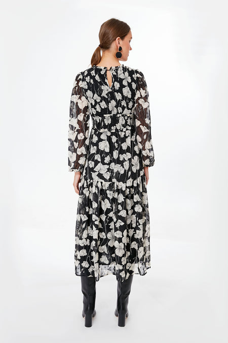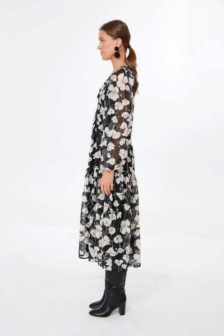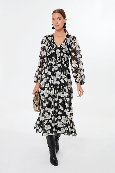 With a soft and neutral print that is wearable for any occasion, we are loving the Black Floral Multi Dress. Transitional as ever, this midi features a smocked bodice that is as comfortable as it is flattering, voluminous sleeves that are left unlined for a bit of fun sheerness, and a fluttery tiered skirt that drapes beautifully. A stunning option to wear with knee boots for weekend getaways, or with heels for dinner parties, we know you'll reach for this effortlessly pretty silhouette over and over again.