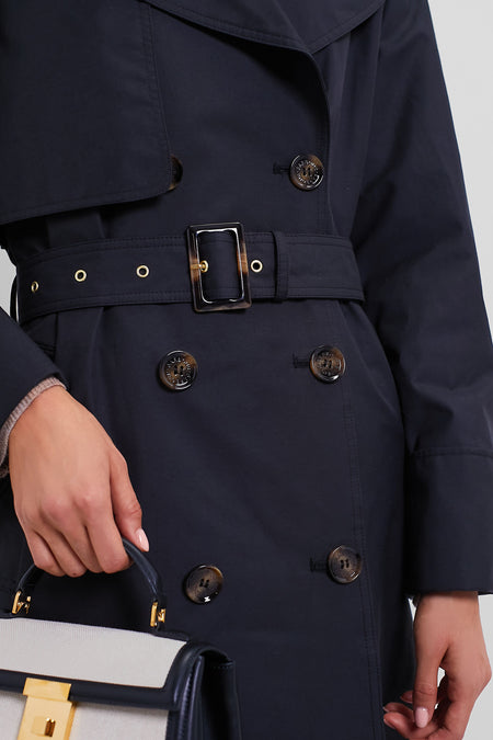 Boasting a beautiful brand signature tartan lining and adorned with faux horn trims, the Black Gwyn Showerproof Trench Coat is an elegant take on the classic and forever timeless style. Featuring a point collar, double- breasted front, and removable belt, this water-resistant silhouette has all of our favorite details. Perfect for wet, chilly commutes to the city or strolls in the park, this piece can be worn over all your favorite outfits from cocktail dresses to athleisure!