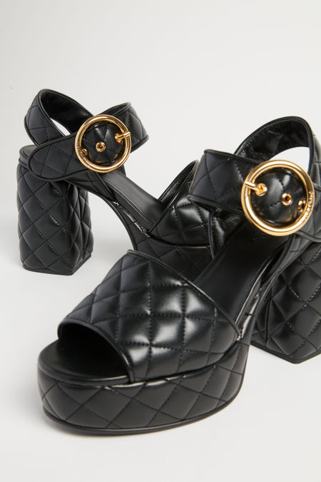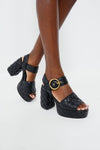 The Black Jodie Heels are here to add a touch of edge to our closet! Full of sassy energy and unfussy femininity, these quilted leather platforms featuring an open toe, an adjustable ankle strap for a secure fit, and a gold buckle at the side. Styled with a fresh and fun midi dress or with your favorite jeans, these shoes automatically bring some spunk to any look.
