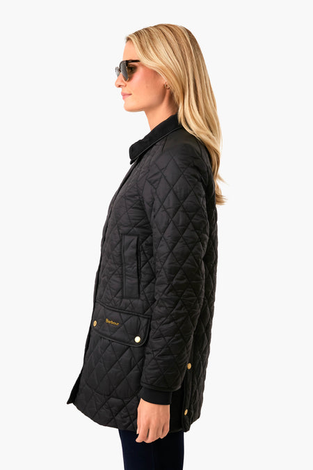 Showcasing an all over box quilt design, the Barbour Kilmarie Quilted Jacket boasts a cord collar, pocket piping, and leather detailing on the shoulders. Lined with Barbour’s classic plaid and styled with rib cuffs, a snap storm flap, and studded back vents, this coat offers unwavering warmth with a classic sense of style. Perfect for everything from apple picking to gameday tailgates, we are pairing it with jeans and leather sneakers.