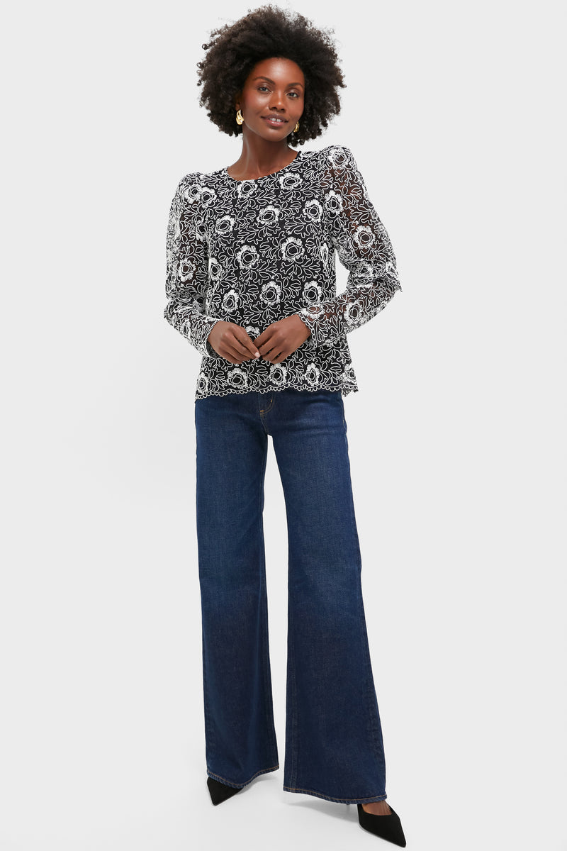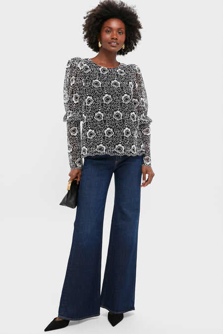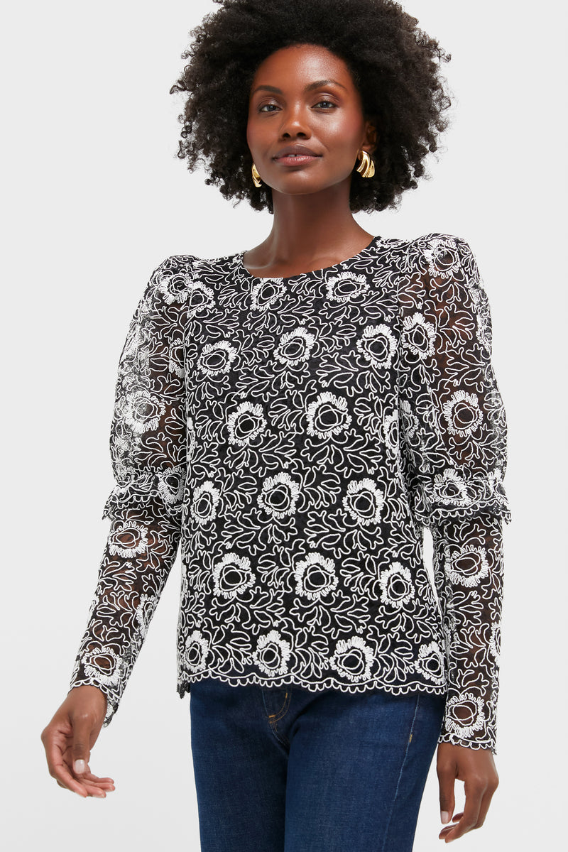 This blouse exudes femininity with its ruffle sleeve detail, delicate lace overlay, and chic puffed shoulders. A go-to for date nights or cocktail events, style it with a maxi skirt and boots or black jeans and heels.