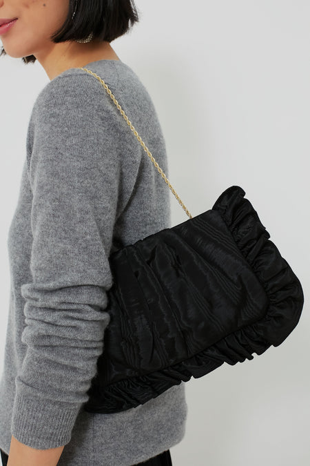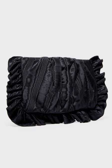 Make a classic, elegant statement with the Black Mavis Ruffle Clutch. The ruffle edge adds a graceful touch, while the removable twisted gold chain strap allows for versatility. Complete with a frame closure and interior card slot to keep your valuables safe, this will be your new best friend for formal parties and events.