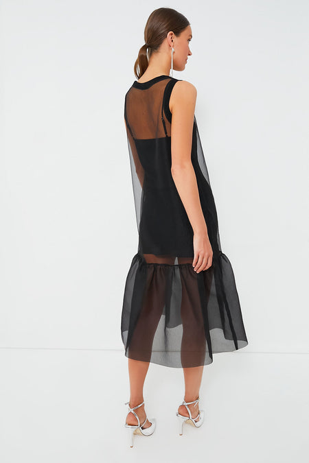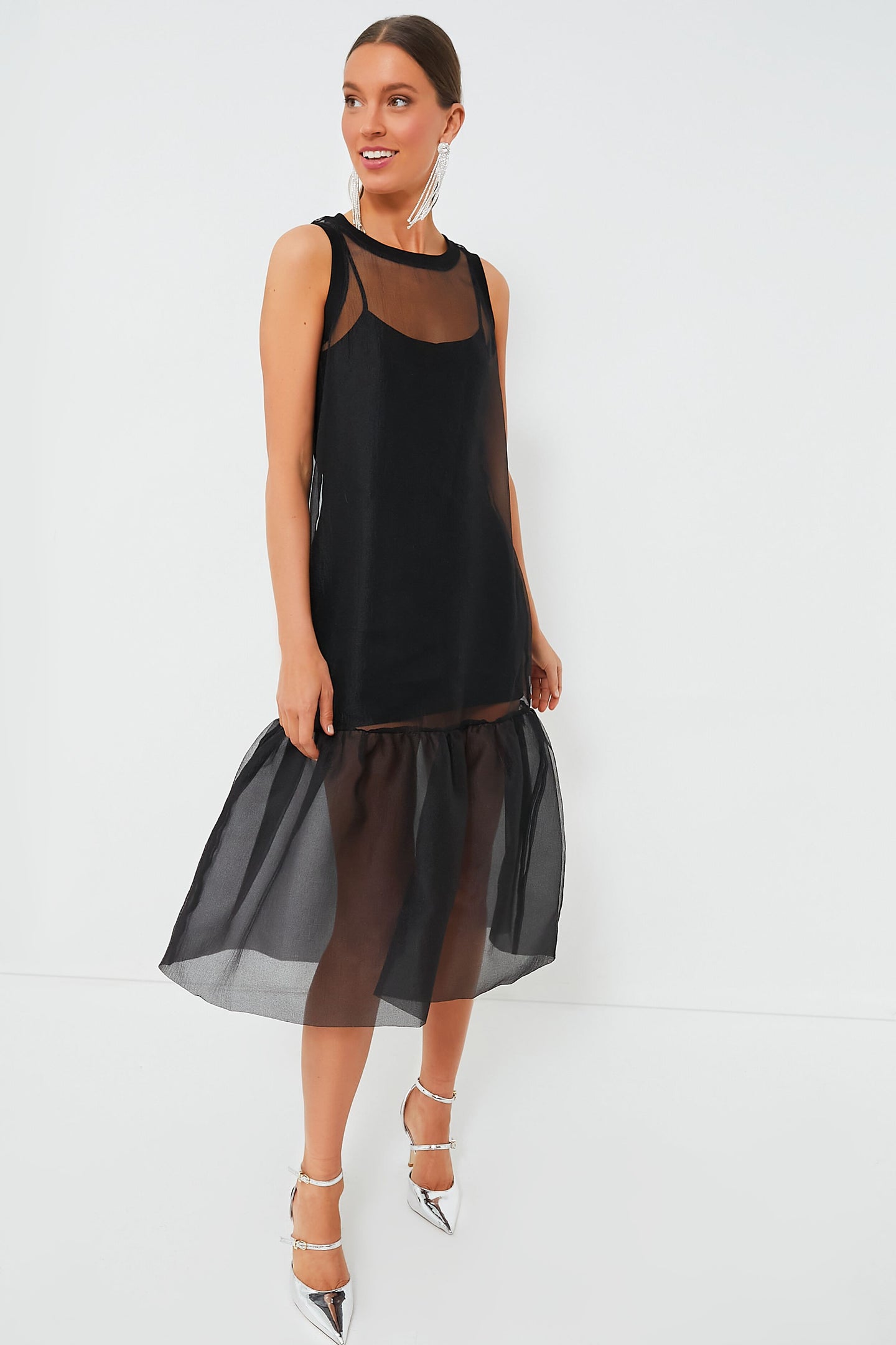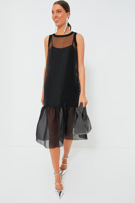 Introducing the Black Midi Organza Ribbed Dress- an elegant, modern twist on the classic LBD that we all know and love! This style features a ribbed neckline, a gathered ruffle waistline, and a sheer fabric with a slip underneath, creating an eye-catching silhouette. Pair with black heels, statement earrings, and a clutch for an outfit that screams "cool-girl-chic".
