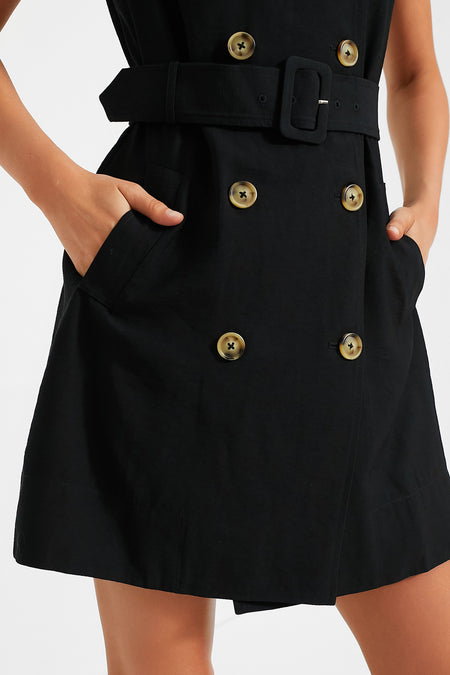 The classic trench takes on a new meaning in the Black Mila Dress. Featuring a notched lapel collar, double breasted button closure, and side seam pockets, this mini is an easy throw and go style this season. Perfect for the transitional weather ahead, pair with a cross body and flats for a Sunday brunch or with a blazer and sling backs for a work to dinner look.