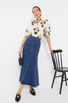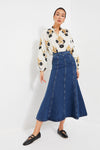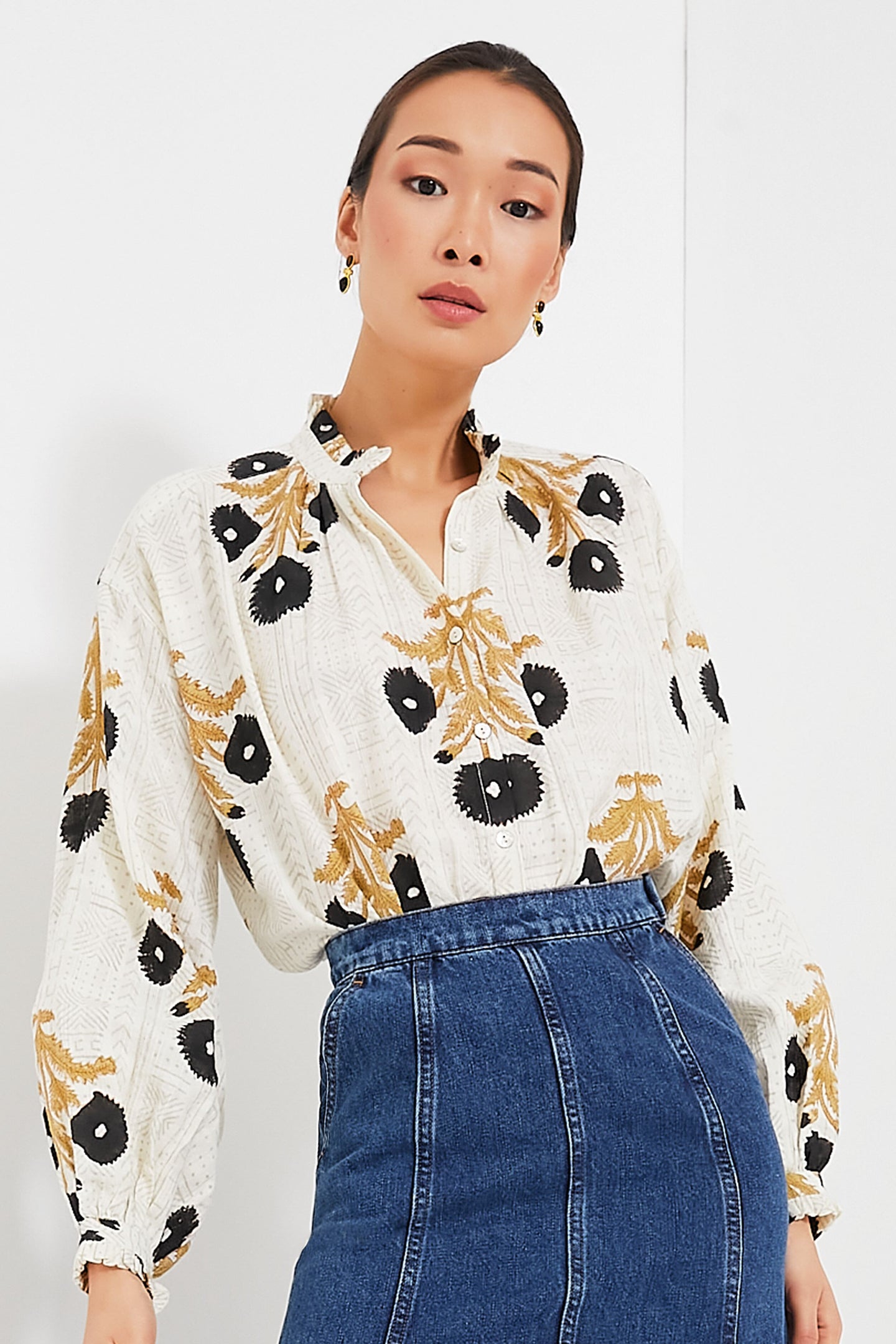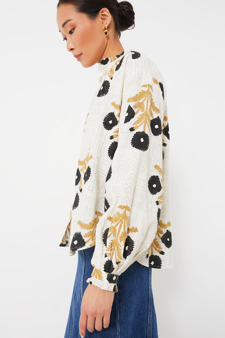 Blooming with earthy hues and hand-block printed flowers, the charming Black Noir Triple Bloom Blouse is a staple in any season. Finishing touches include a ruffle details on stand collar and cuffs, mother of pearl buttons down the placket, and a floaty fit that all come together to create an understated but elegant top. Made of lightweight and breathable cotton, this style is beautifully paired with trousers for an elevated ensemble or tried-and-true denim for a retro-inspired boho-chic look.