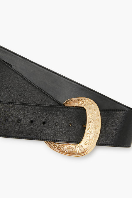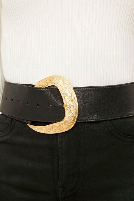 The Black Outlaw Belt is a hip belt designed to make a statement. The perfect combination of playful and edgy, it is adorned with scrollwork and an asymmetrical buckle. This versatile piece is handcrafted and will become your new go-to accessory.