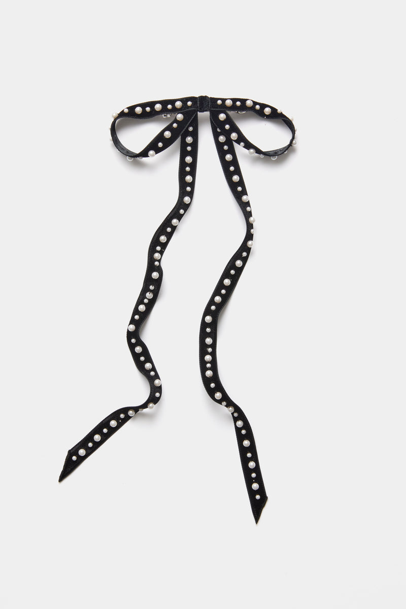 The Black Pearl Annalee Bow Barrette has a distinctly whimsical appeal, featuring embroidered pearls in a playfully exaggerated bow. Crafted from silk velvet, the bow's extra-long tails ripple through the hair like streamers. The bow is finished with an automatic French barrette closure, for easy placement in any style.