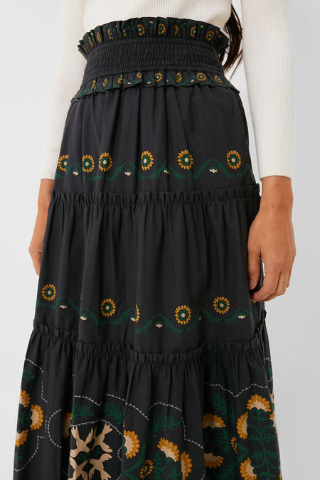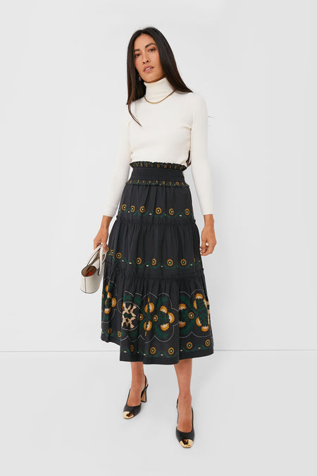 Transitional dressing calls for on-trend midis, and the Black Perle Print Skirt certainly delivers! A flattering high rise combined with a smocked waistband makes it ultra-comfortable so you can wear it anywhere and everywhere, and the tiered body with ruffle trim brings flowy movement that we can't get enough of. Pair it with a turtleneck and flats for daytime, then swap them out for a silky blouse and heels for evening.