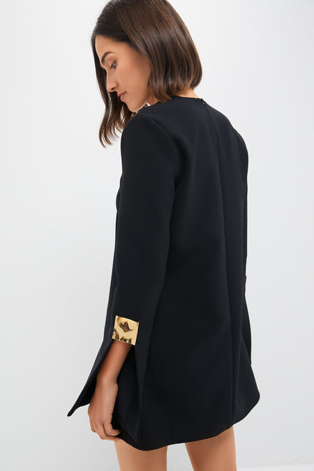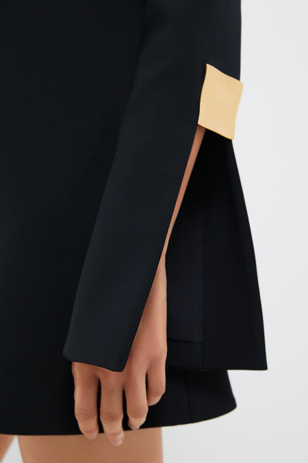 The Petra Dress features a structured silhouette with a deep V-neckline, complemented by a unique metallic detail that draws the eye. Long sleeves with subtle slits add a touch of movement and sophistication, while the clean lines keep the look sleek and contemporary. We are styling it with high boots for a cool-girl look, or with heels for a chic date night.