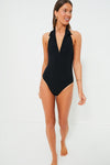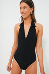 The Black Polo Maillot is a chic 70's tennis inspired one-piece featuring flattering features such as a polo collar and plunging neckline. Created in an exclusive, luxurious, seersucker fabrication, it is sure to be a closet favorite. Pair with simple sandals for a day at the beach, or wear as a body suit with wide leg pants!