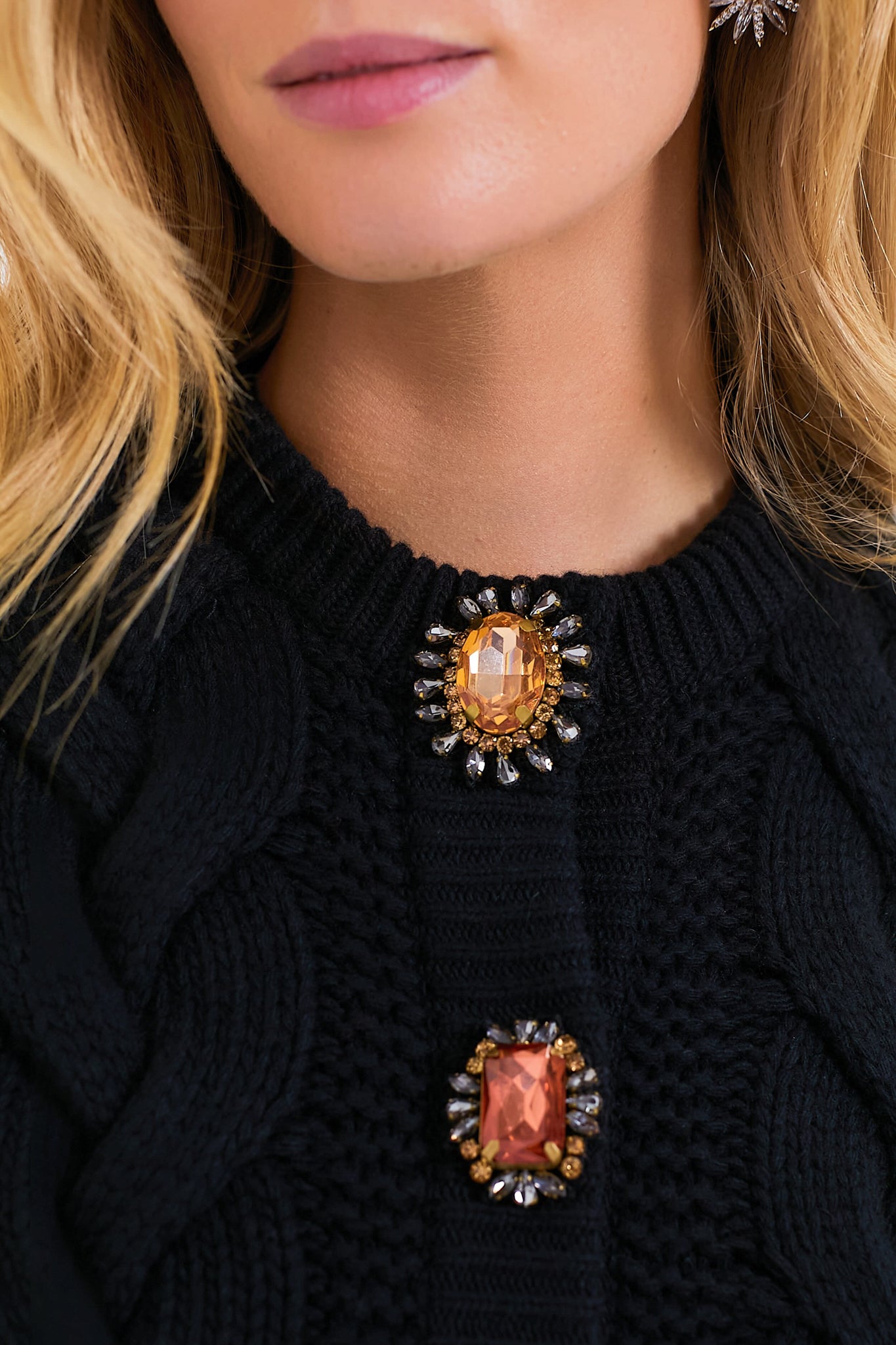 Detailed with a row of oval crystal embellishments along the placket, and knitted in a chunky cable pattern, the Black Portrait Cardigan is a glamorous timeless number your closet needs. Instantly elevates any outfit, style it with minimal jewelry to keep them in focus.