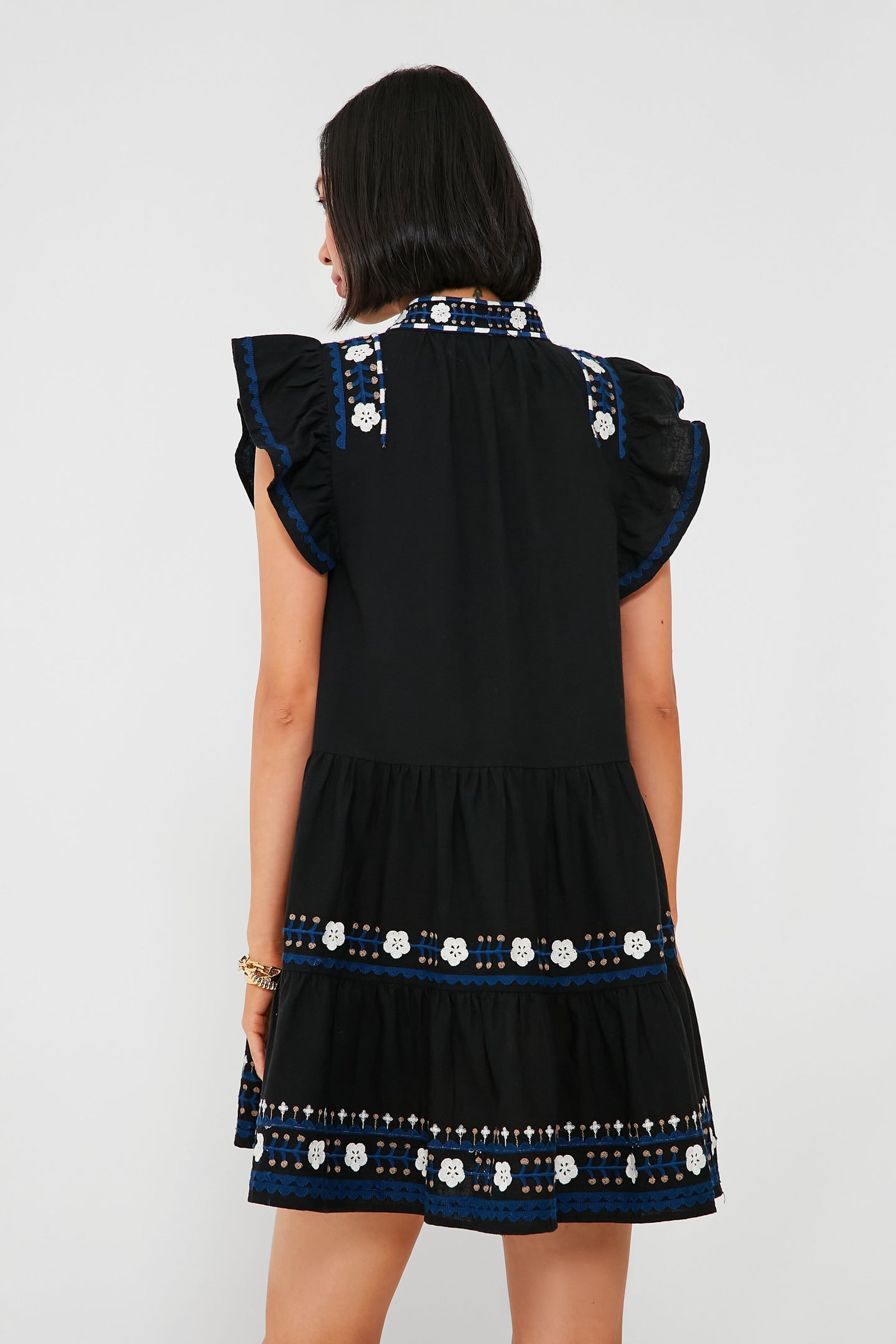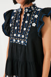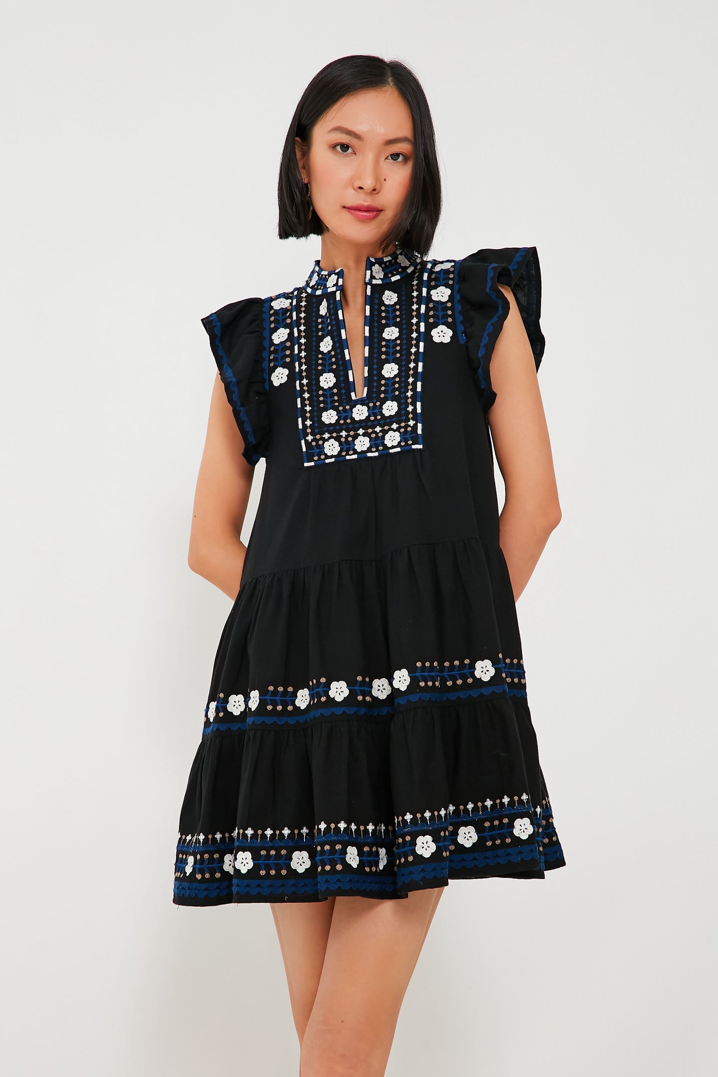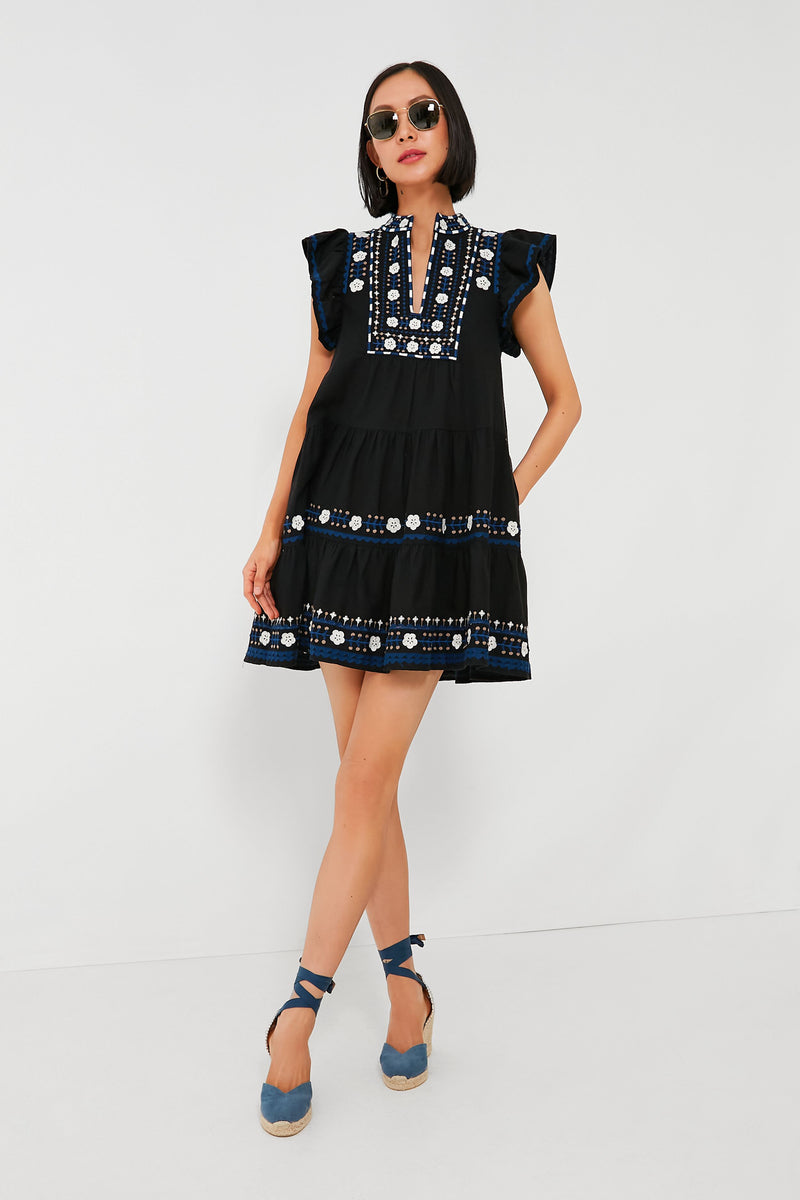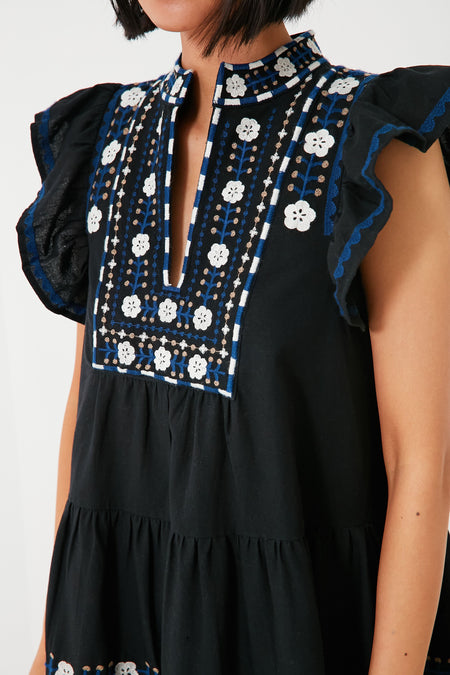 Designed for an easy-breezy and relaxed fit, the Black Shaina Dress is adorned with delicate floral embroidery that lends an elevated bohemian feel to this stellar mini. A band collar with a split neckline bring a little intrigue to the silhouette, while short flutter sleeves and a tiered skirt are just begging to be worn somewhere with a warm breeze. Made from a lightweight and super-comfortable cotton-linen blend you are sure to love, this is a perfect wear-anywhere look. Dress it up with espadrilles and gold jewelry for backyard parties or dress it down with sneakers and sunnies to run errands in style!