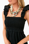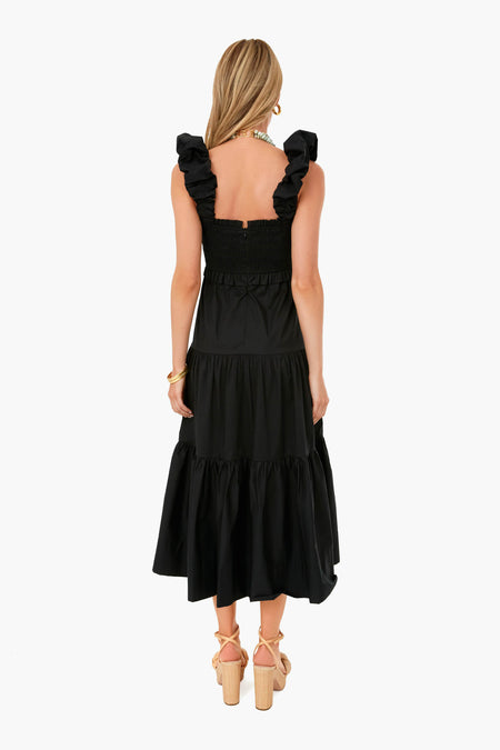 With a square neckline and ruched straps, the Black Sloane Sleeveless Dress is effortlessly chic. A smocked bodice and tiered skirt make this midi perfect for afternoon picnics or going out for drinks in the evening. Pair this style with block heels and a statement necklace, or with sandals and a sunhat for a more casual look.