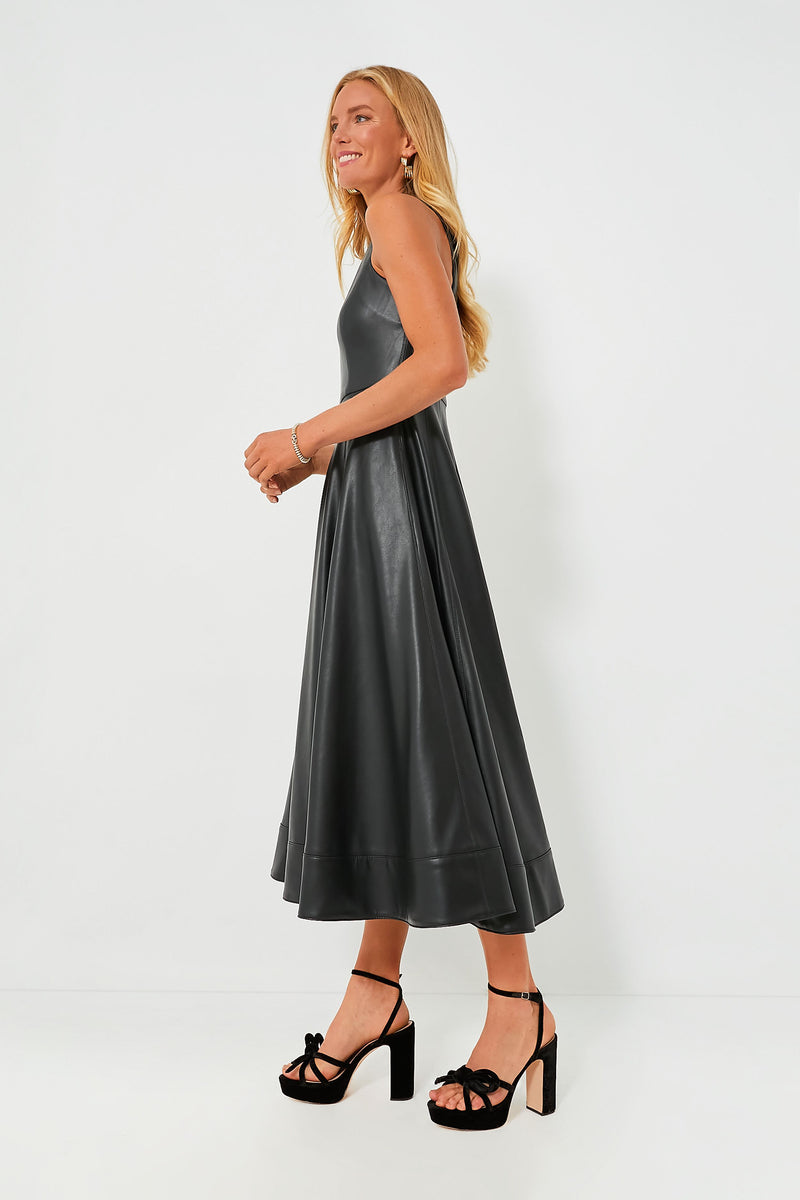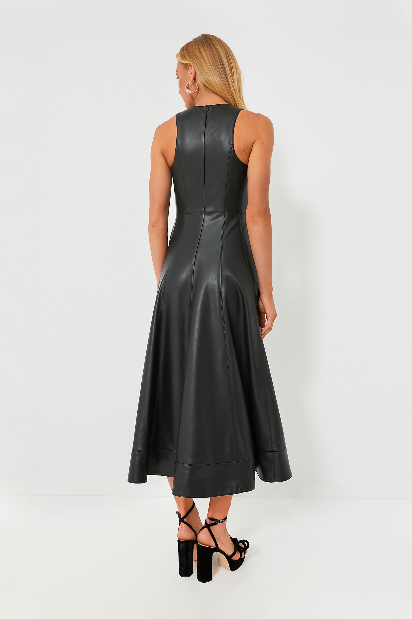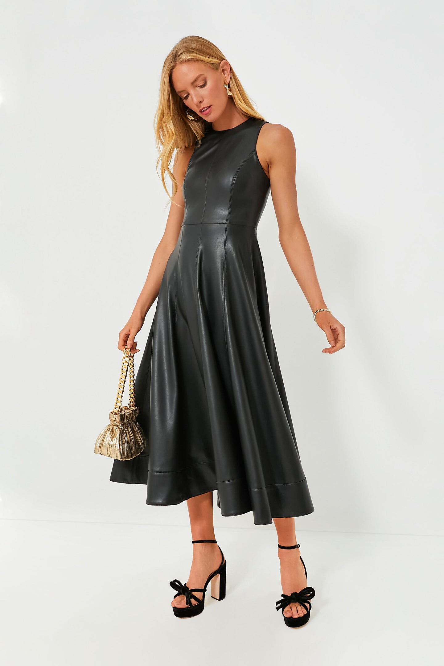 Look beautiful and chic with the Soline Dress. Crafted with vegan leather, it features a classic A-line midi silhouette with a crewneck, fit to flare design, along with pockets for a touch of modern style. Perfect for all seasons, we are styling this dress with a chunky gold necklace, black block heels, and a clutch purse for a striking date night outfit.
