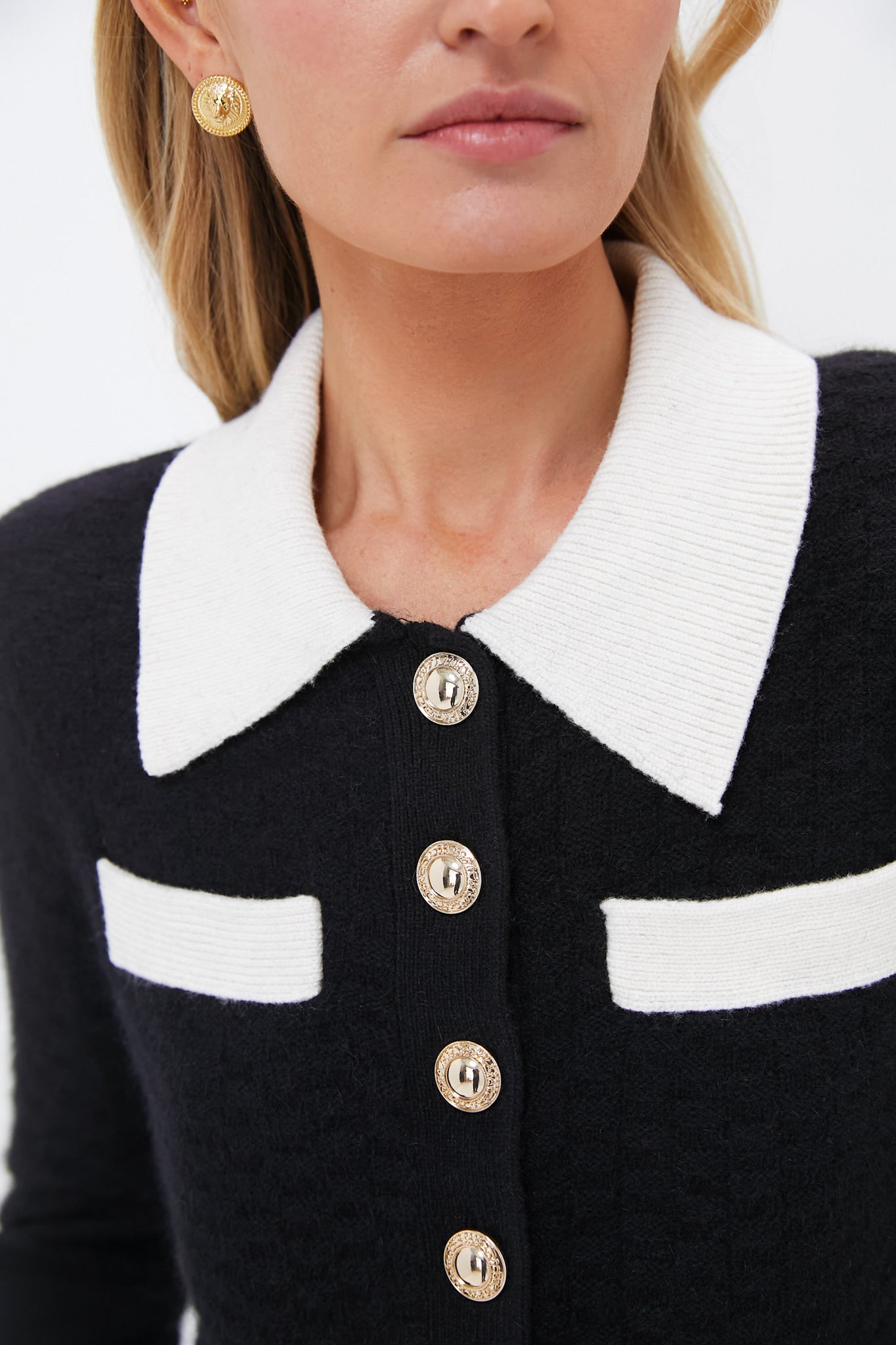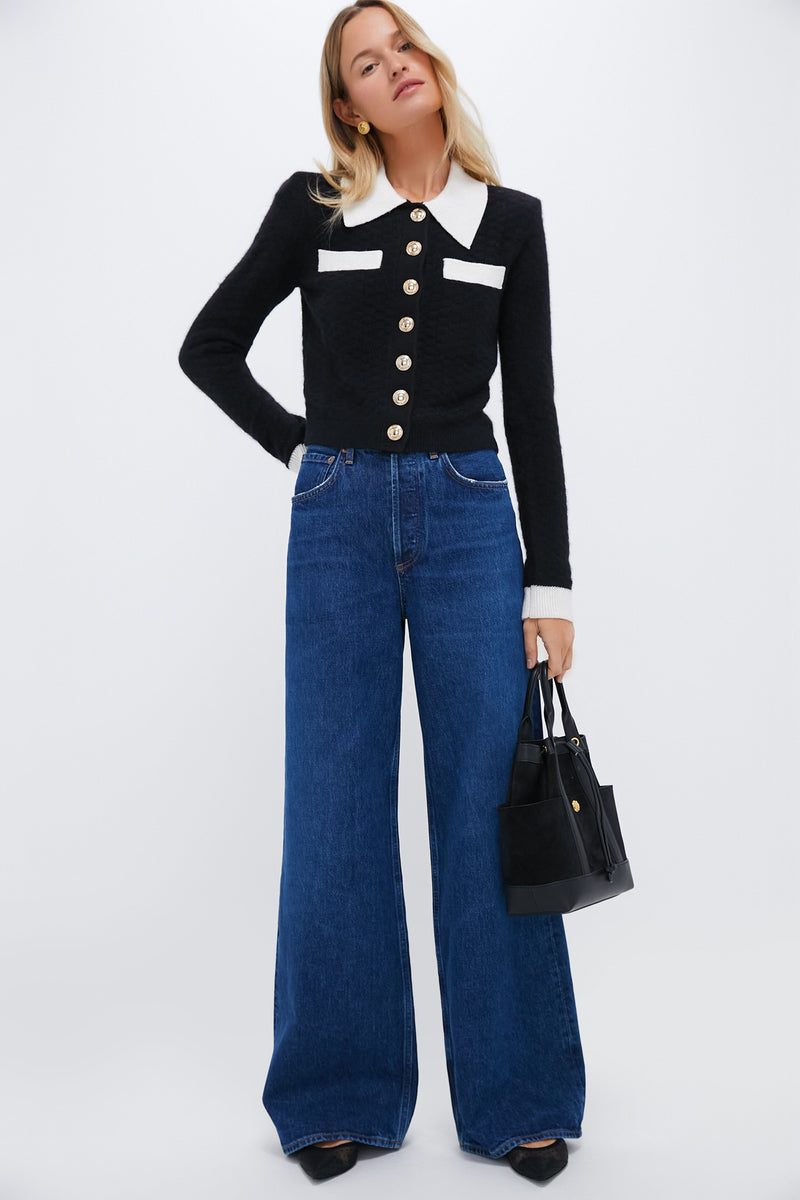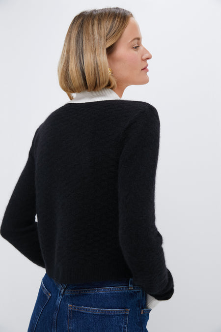 Clean lines and a high-contrast palette give this cardigan a polished feel. The cropped cut pairs easily with high-waisted bottoms – choose denim and flats for day and a sparkling mini for night.