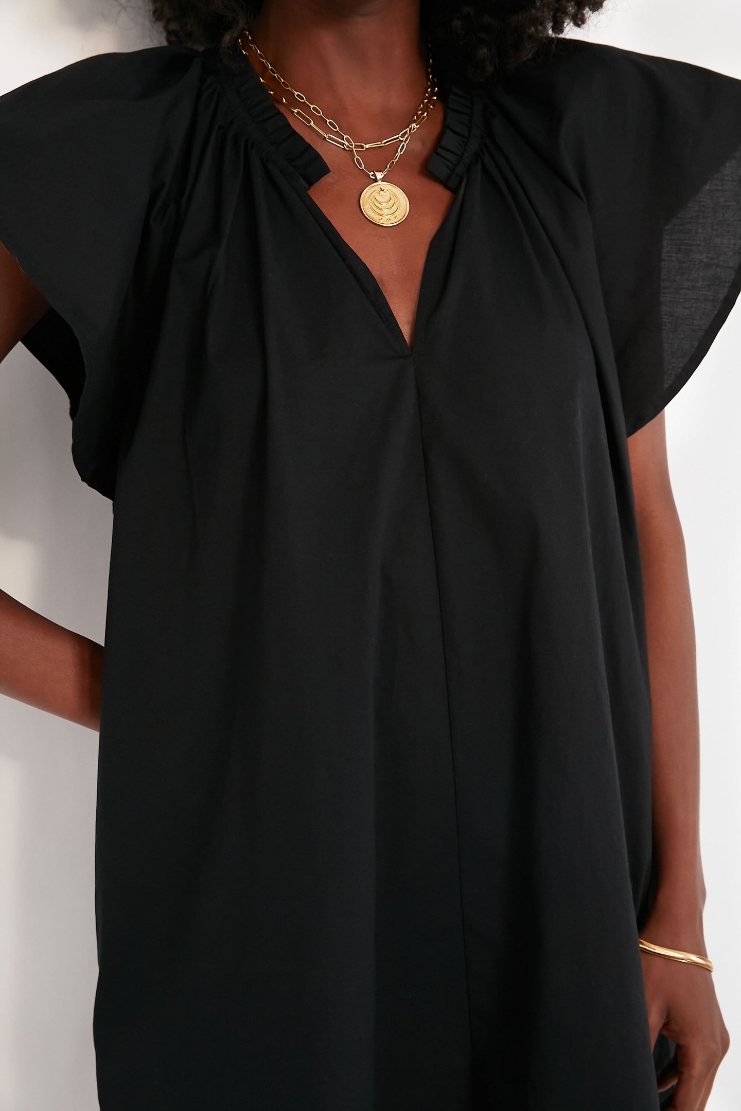 LBD meets warm weather dressing and you have the Black Vivi Dress. This mini was designed with a loose fitting silhouette that is balance by feminine ruffle and pleat details around the neckline. Add sandals, a sunhat, and oversized sunnies for an effortlessly glamorous effect. Bonus: it has everyone’s favorite dress design detail– pockets.