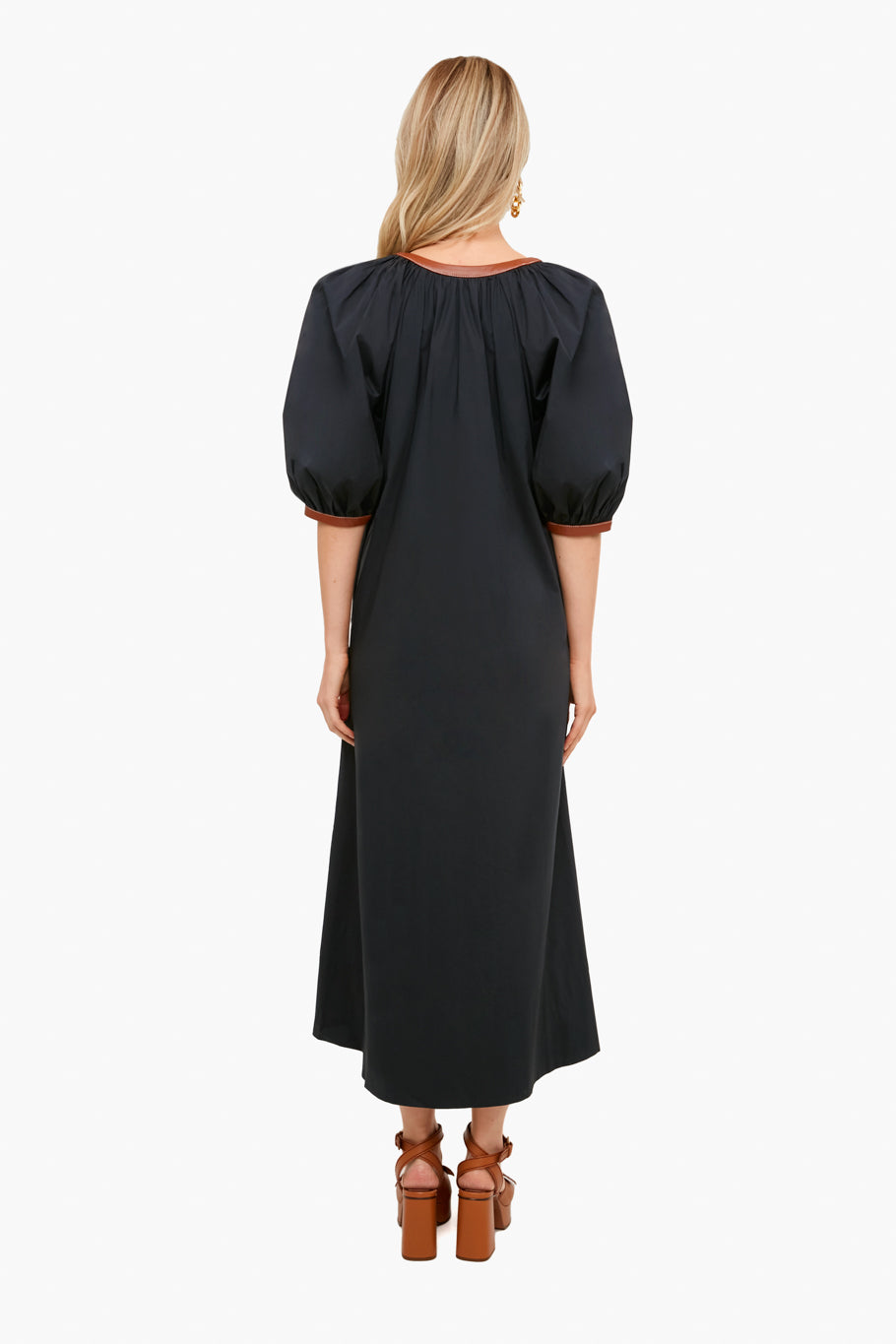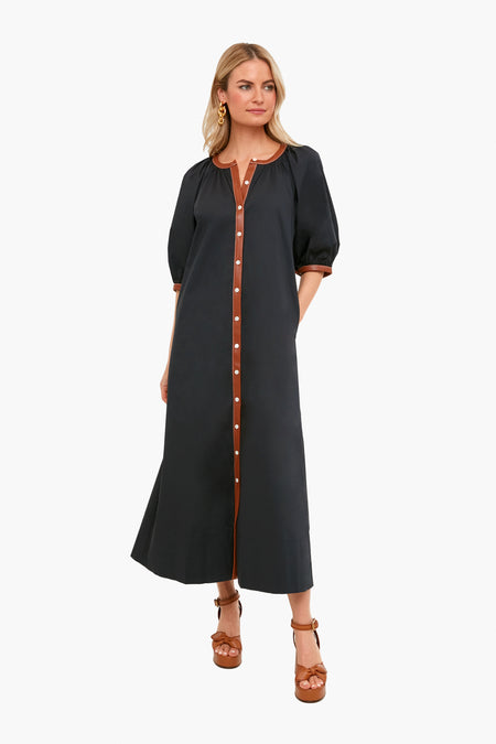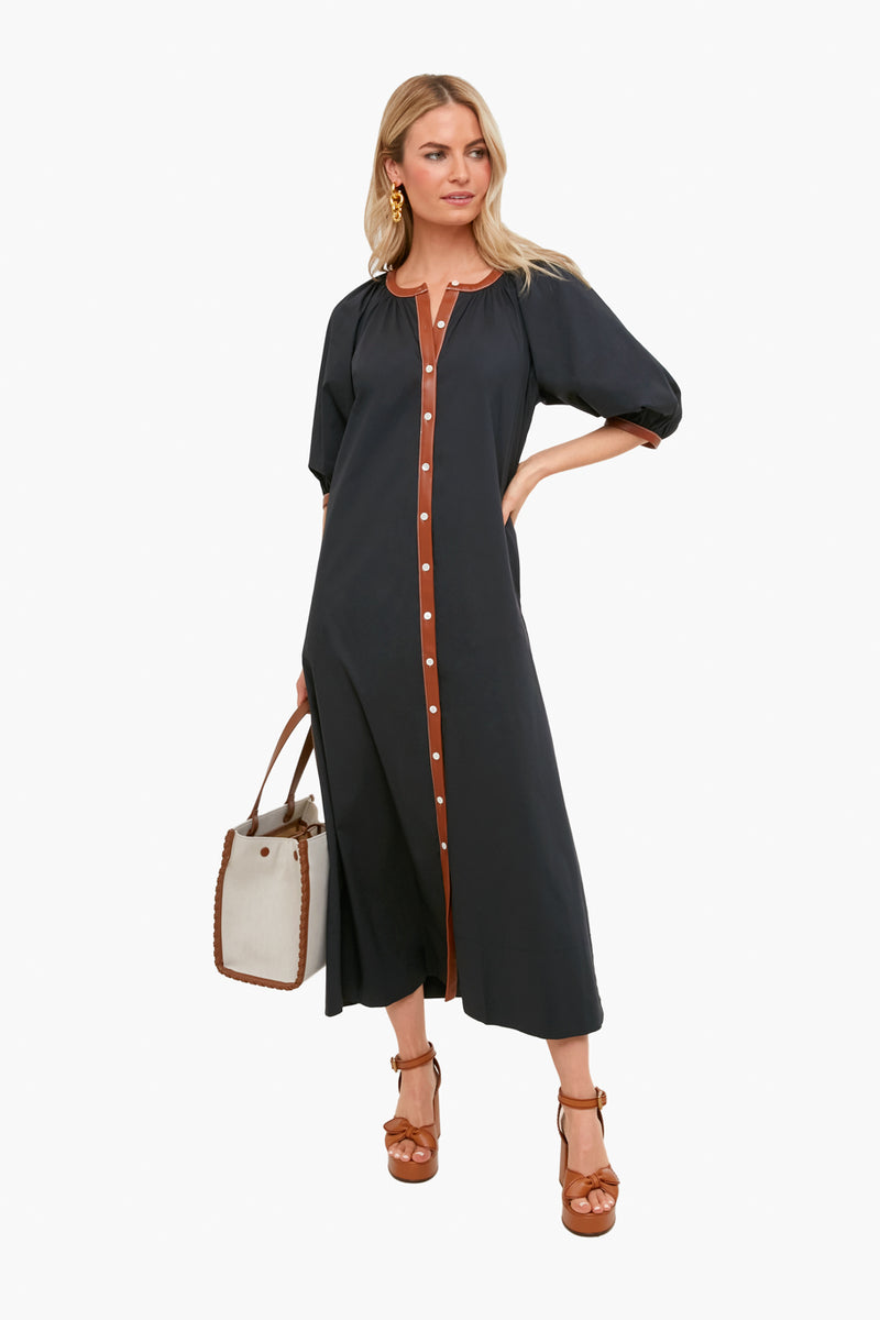 Less is more with the Black Whiskey Vincent Dress. Crisp, chic, and understated, this faux leather-trimmed caftan will carry you from season to season with a switch of accessories. Pair with heels and gold jewelry for drinks with friends.
