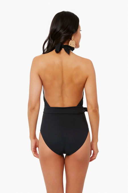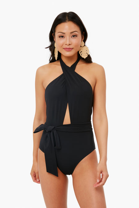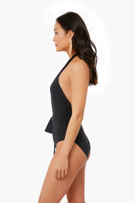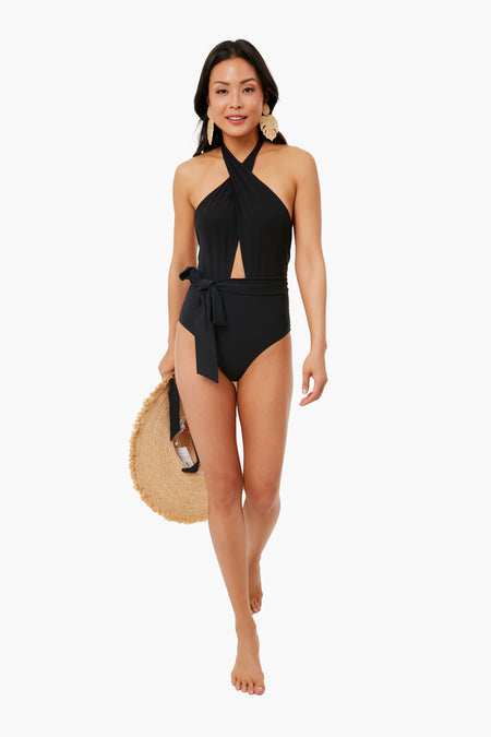 The Black Wrap One-Piece balances alluring cut-outs with supportive coverage, creating a perfectly chic silhouette. Its shape accentuates the narrowest part of your waist, with a flattering tie front and halter neckline. Made from the highest-quality Sensitive® Fabrics by Eurojersey (a world-renowned source from Italy), which features four-way stretch, impeccable fit, long lifespan, and SPF 50 sun protection. A vacation essential, just add sandals and a sunhat!