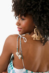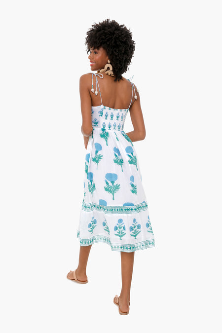 The Boom Blue Midi Dress features fully adjustable tie straps with whimsical bauble accents. This style is made from luxuriously soft cotton, with a vibrant hand block-print. Pair with raffia earrings and sandals for an island-chic vibe.
