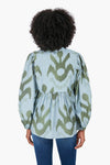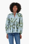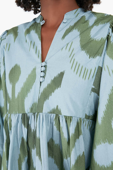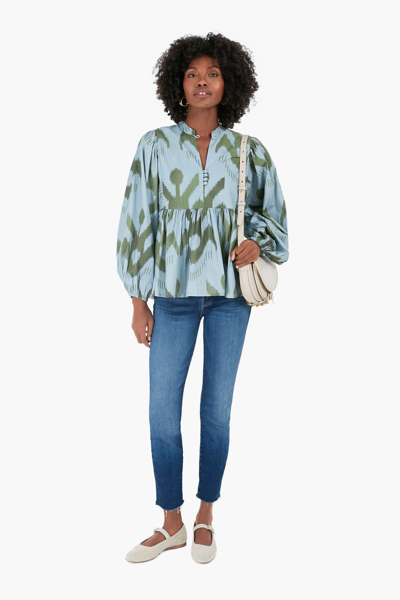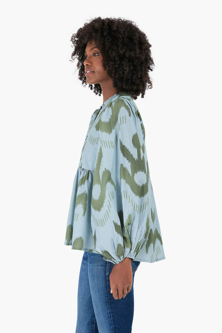 An airy cotton blouse in a vibrant print completes any wardrobe, and the Blue and Green Mandarin Balloon Top will do just that. With a notched neckline that features beautiful covered buttons and voluminous puff sleeves, you will reach for this easy silhouette time and time again. Pair with white denim and sandals for an "I just got back from vacation" look, or style with statement earrings and a clutch for dinner and drinks.