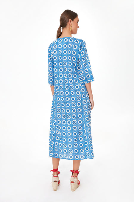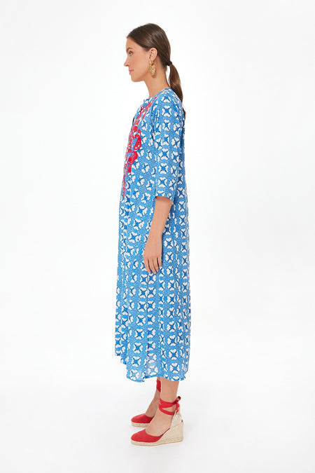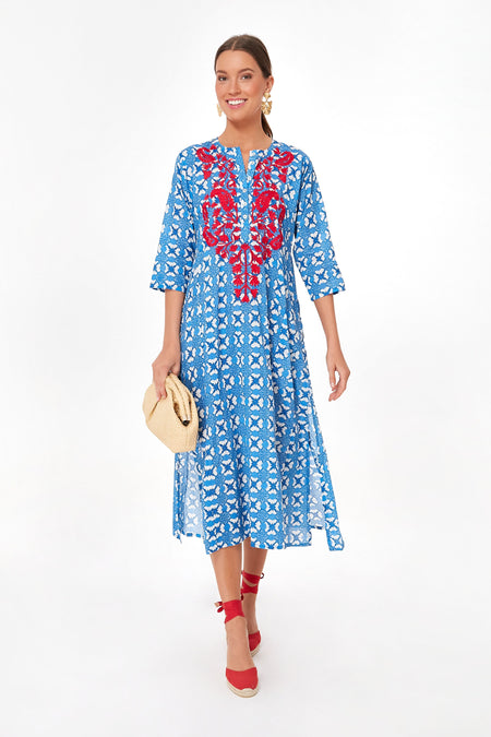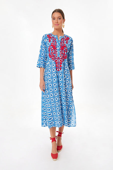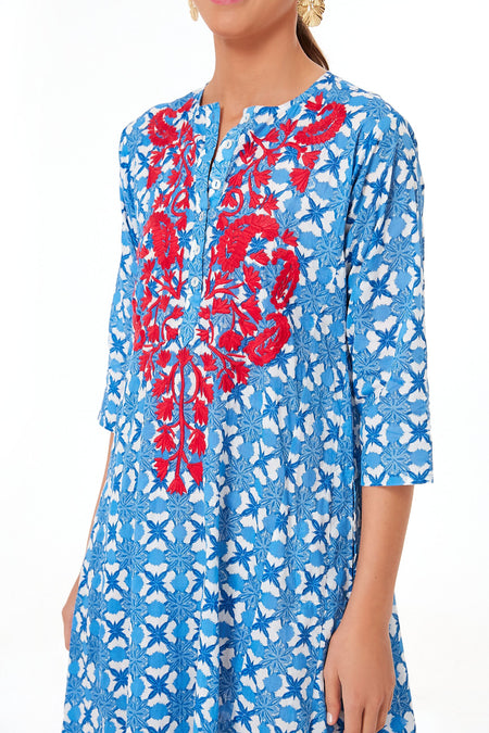 Playful and practical, the Blue Barbados Long Kurta features a colorful floral print with contrasting embroidery details, three-quarter length sleeves, and a button front placket. Made from breezy cotton, this breezy number can be worn over swimsuits or styled with a statement accessories and sandals. Whatever you have planned, this caftan is an ideal companion, equally at home on the beach, by the pool, or lunching at the club.